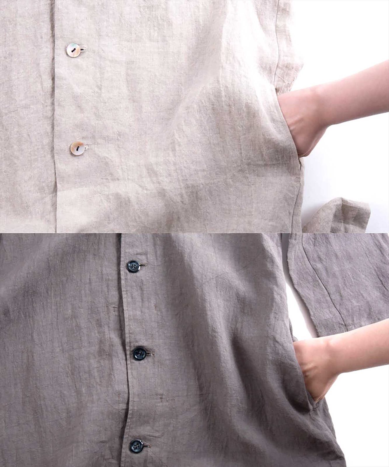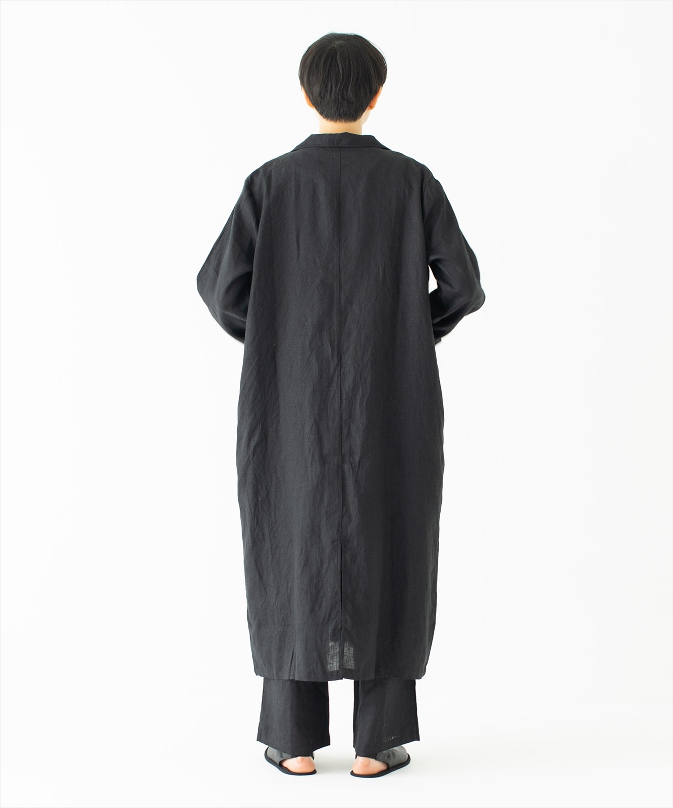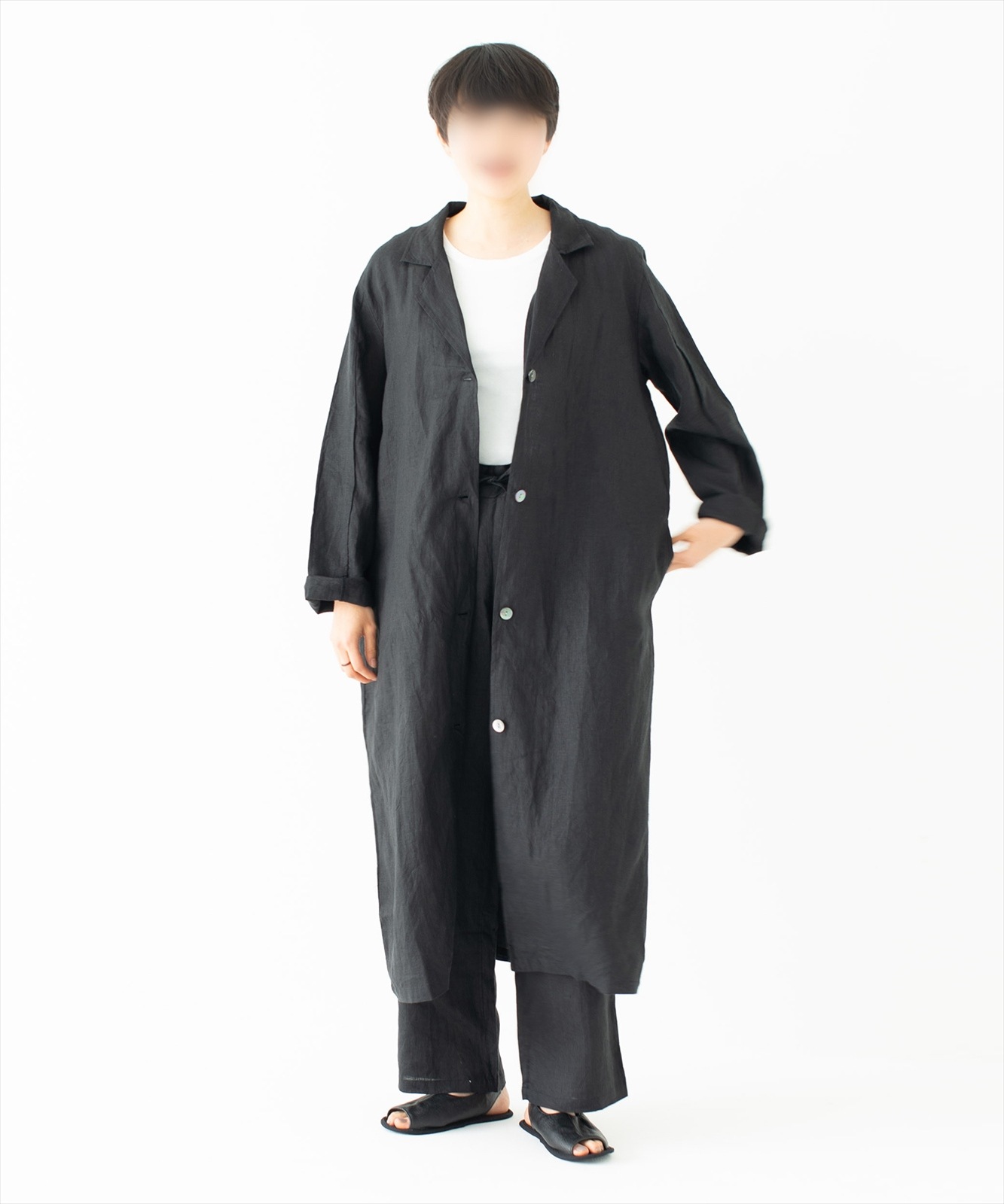 - 通気性の良いリネンに洗いをかけたラフさにこだわった質感と、個性的でゆったりと着心地が良い、リラックスできるシルエットに仕立てています。