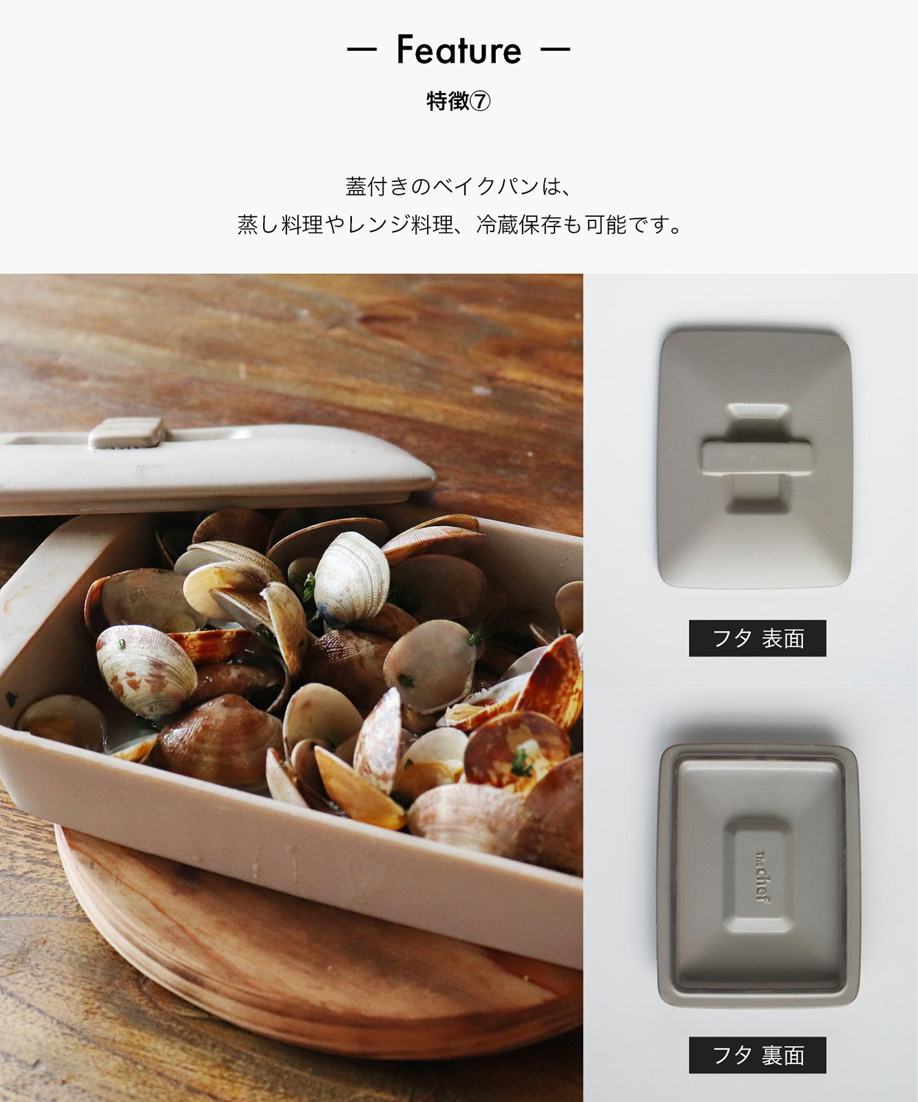 - The chefシリーズは、蓋なしタイプの「ベイクディッシュ」と、蓋付きタイプの「ベイクパン」の2タイプがございます。ベイクパンは、蒸し料理やレンジ料理、冷蔵保存も可能です。