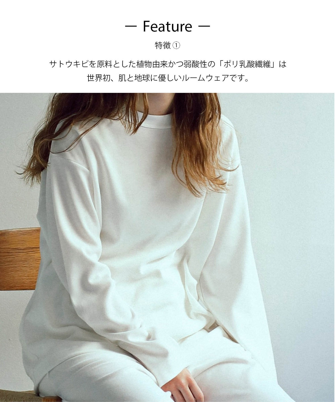 サトウキビを原料とするポリ乳酸の品質と機能を改良した繊維素材「ポリ乳酸繊維」で作られらた世界初のルームウェアです。植物由来かつ弱酸性のルームウェアは、肌と地球資源を守る新しい選択肢となっています