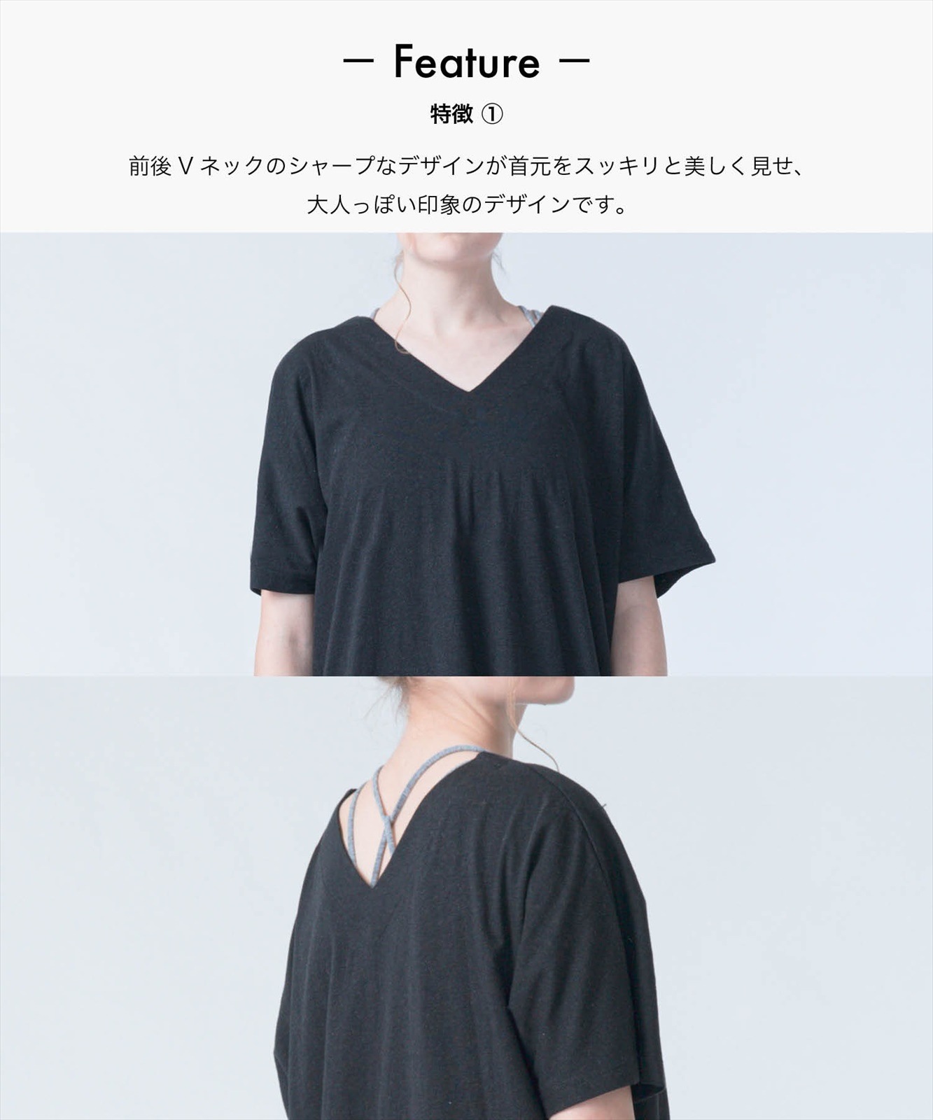 - Vネックのシャープなデザインが首元をスッキリと美しく見せ、大人っぽい印象のデザインです。