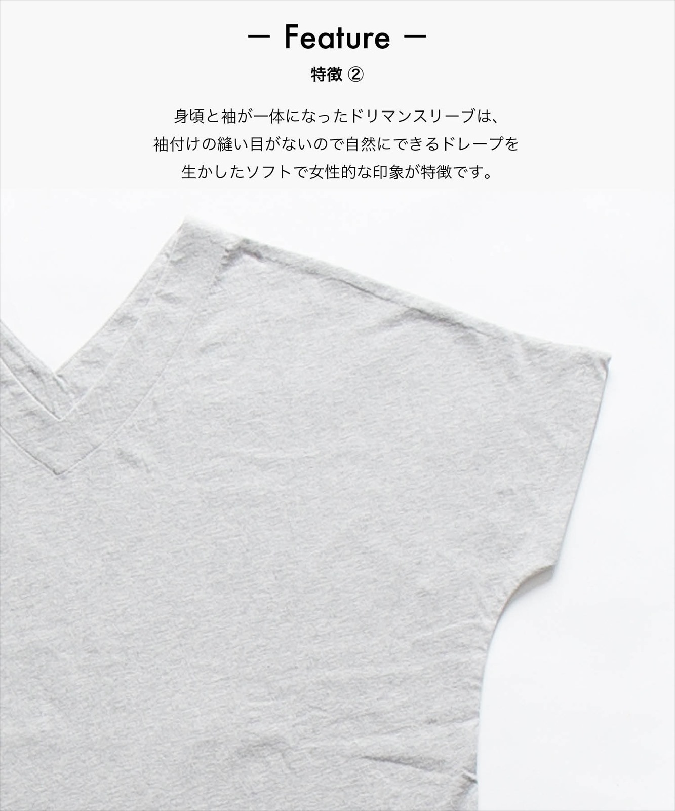 - 身頃と袖が一体になったドリマンスリーブは、袖付けの縫い目がないので自然にできるドレープを生かしたソフトで女性的な印象が特徴です。