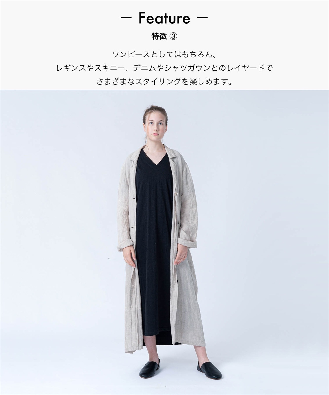 - ワンピースとしてはもちろん、レギンスやスキニー、デニムとのレイヤードでさまざまなスタイリングを楽しめます。