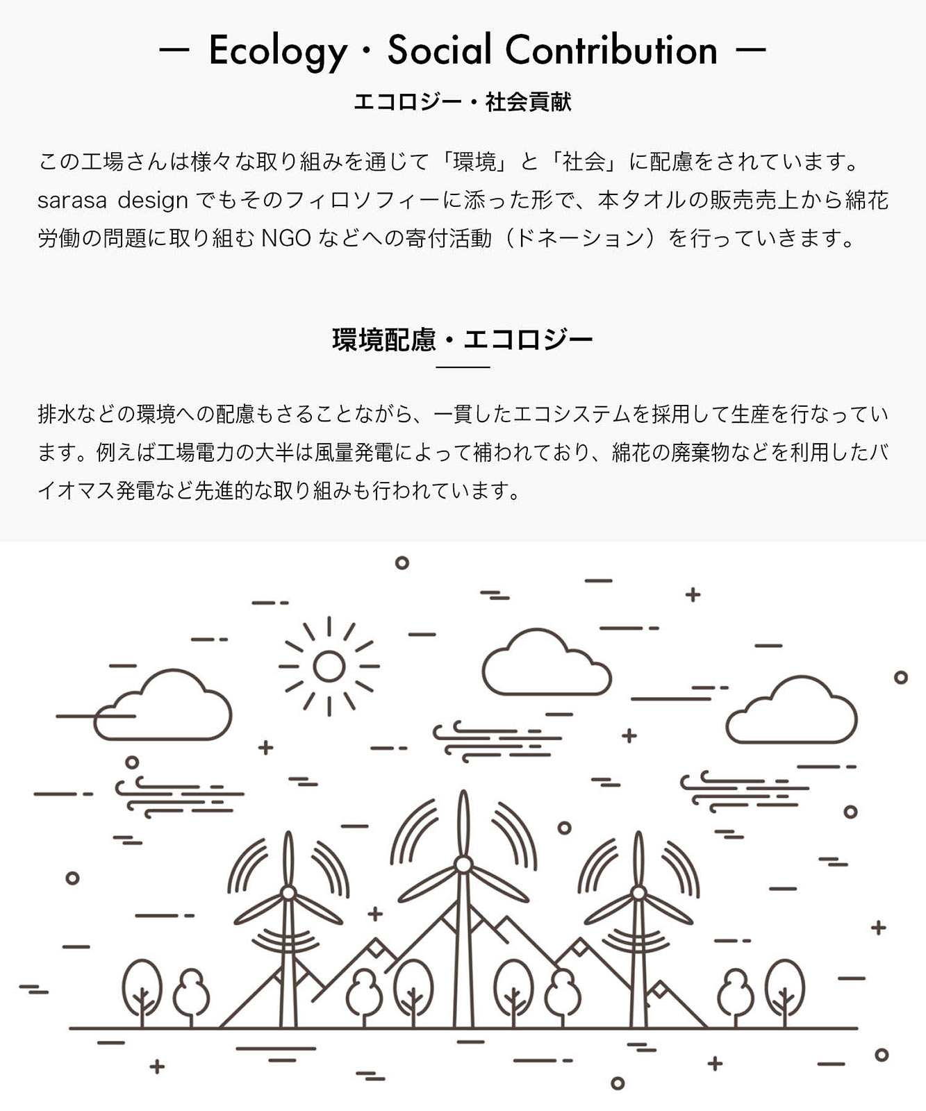 - 原料と紡績にこだわる事で、吸収性とやわらかな質感を両立しています。同じ重さの一般的なタオル地の最大で250-300%の吸水性を持ちます。