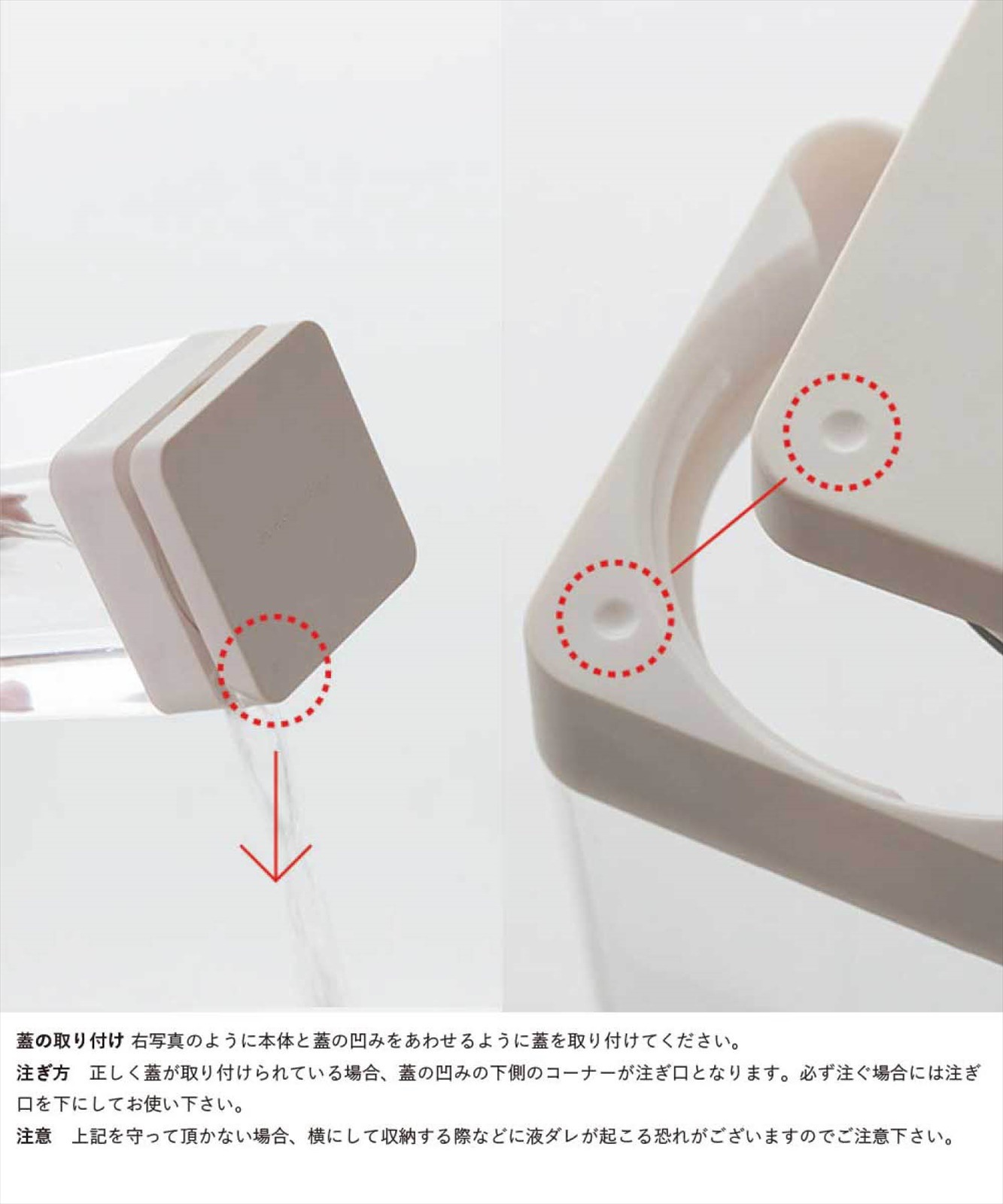- ●本製品は気密性が高いため熱湯を入れてすぐ蓋をすると、内圧の著しい変化により製品の変形・破損・割れが発生する恐れがあります。●必ず室温程度に冷ましてから蓋をしてください。●炭酸水を入れて使用しないでください。●洗浄の際は、クレンザーやたわしを使用しないでください。●電子レンジ、食器洗浄機、乾燥機は使用しないでください。●アルコールを含む製品のご使用は 劣化・破損等する場合がありますのでお避けください。●消毒用エタノールの噴霧などもアクリル樹脂のクラックの原因となります。●上部の蓋は高密閉を保つために開閉時硬く感じますが、人差し指と親指を角に引っ掛けるように回転させると開閉し易いです。●リモネンを含む柑橘系の成分は容器の変質に繋がりますため、ご使用をお控えください。
