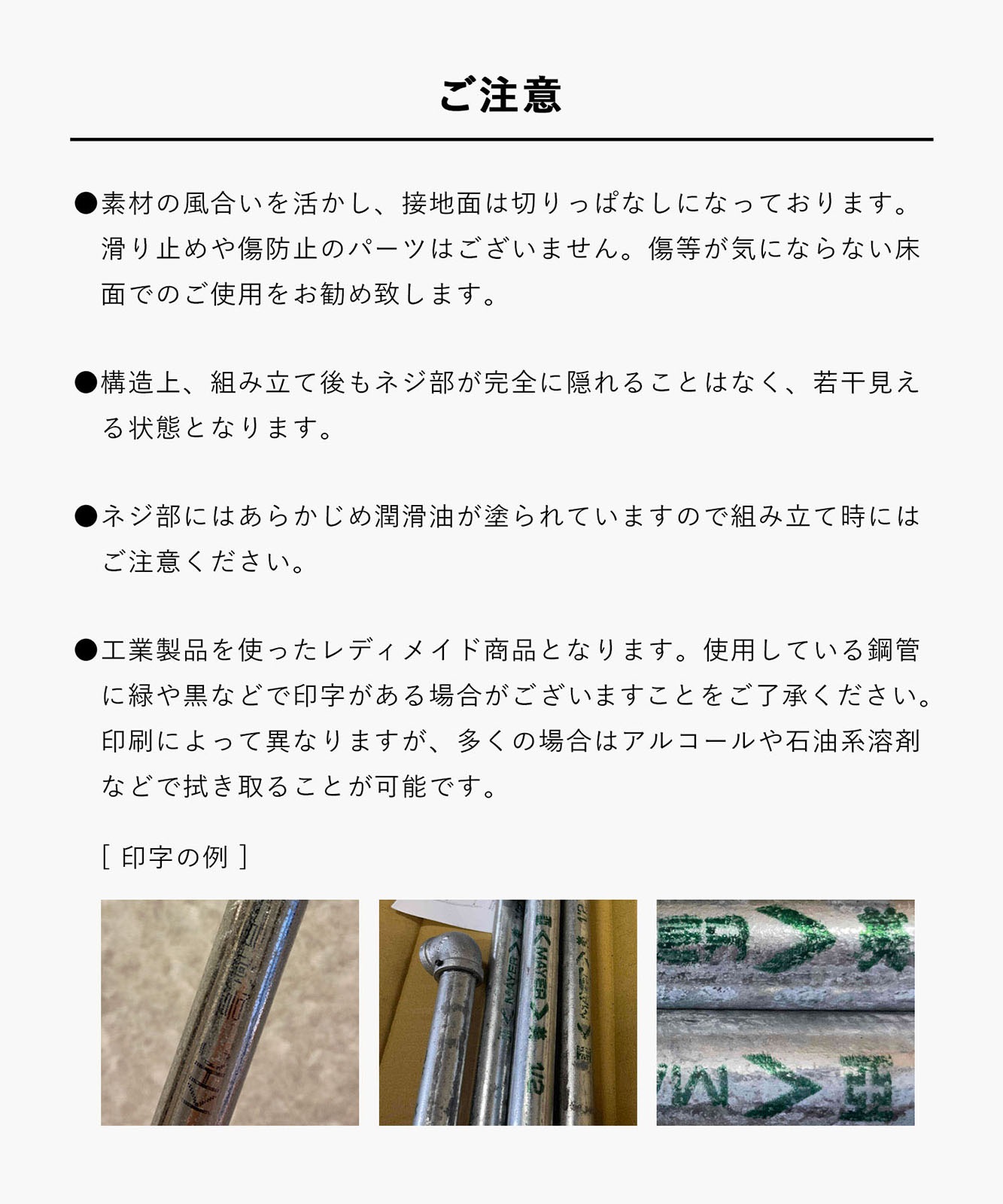 - ●素材の風合いを活かし、接地面は切りっぱなしになっています。滑り止めやキズ防止のパーツはございません。●キズ等が気にならない床面でのご使用をお勧め致します。●構造上、組立後もネジ部が完全に隠れることはなく、若干見える状態となります。●ネジ部にはあらかじめ潤滑油が塗られていますので組立時にはご注意下さい。
