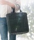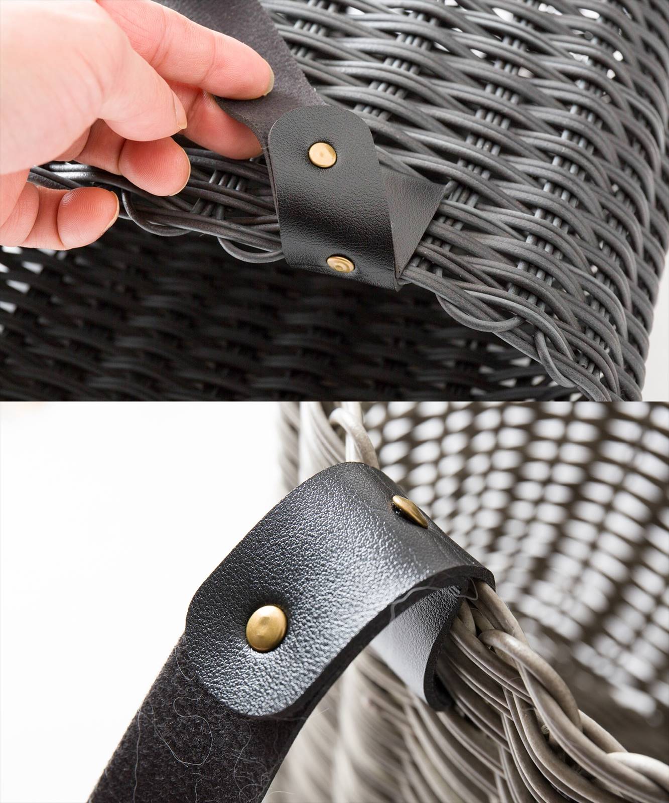 - 黒合皮の異素材のハンドルアクセントが、大人感覚のマルシェバッグとして、目を引きます。