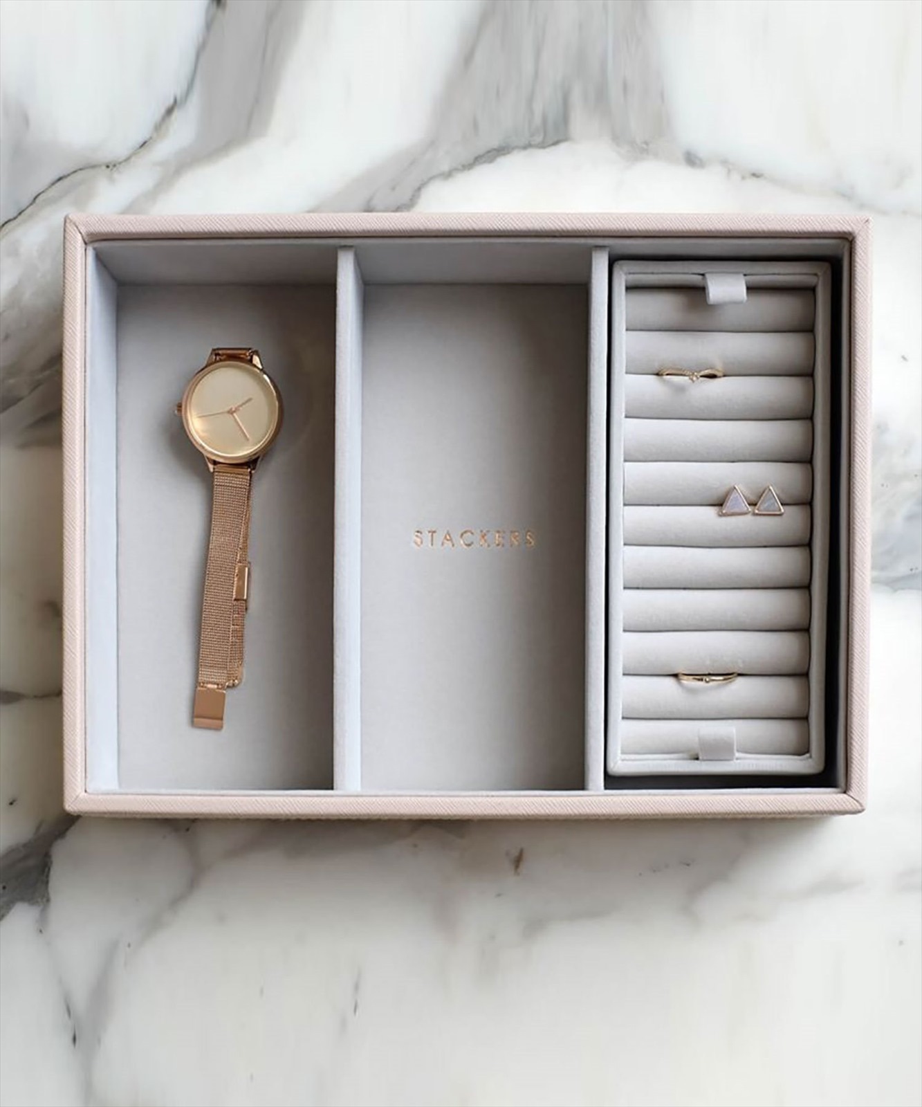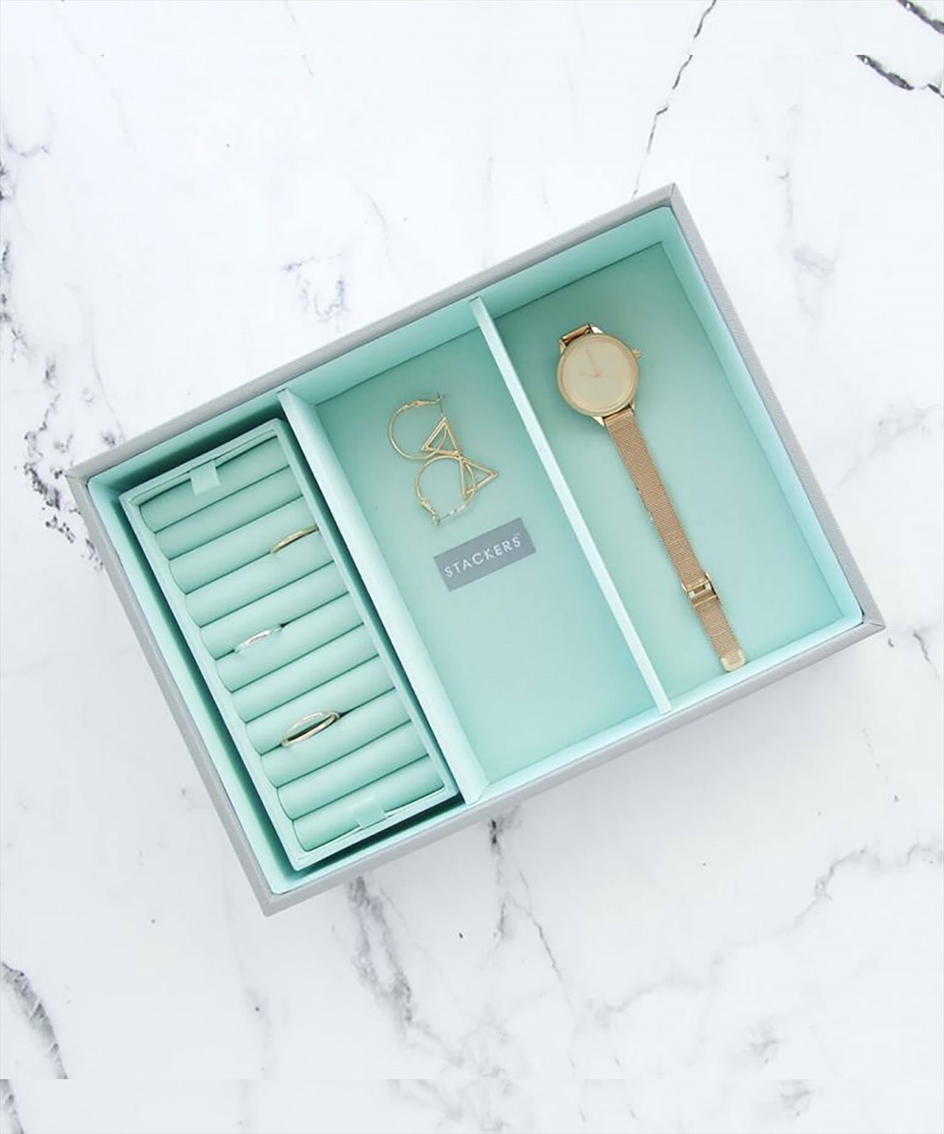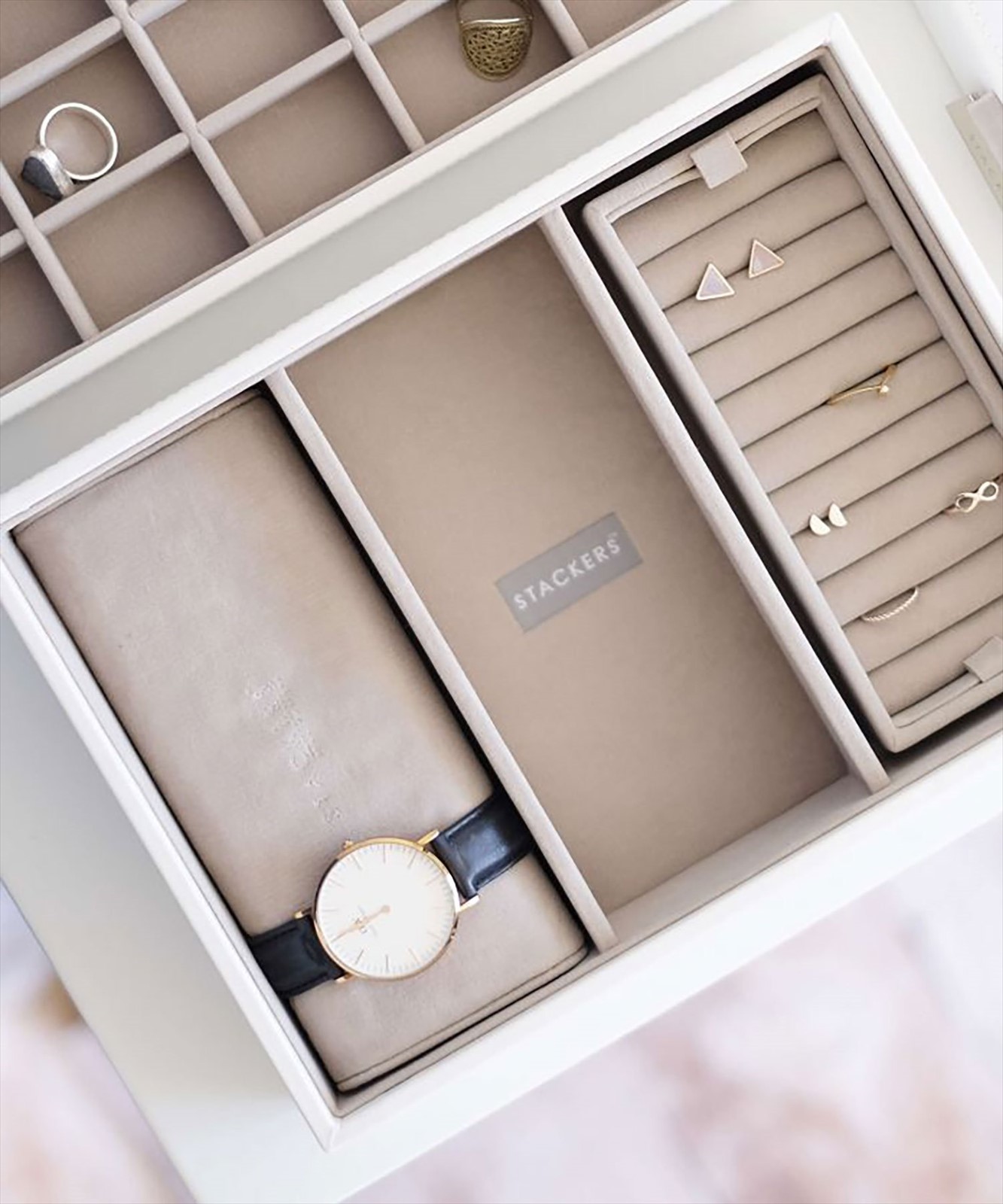 - Stackers 時計&ブレスレット用パッドやリングホルダーを活用するとぴったりと収まるので美しく収納できます。