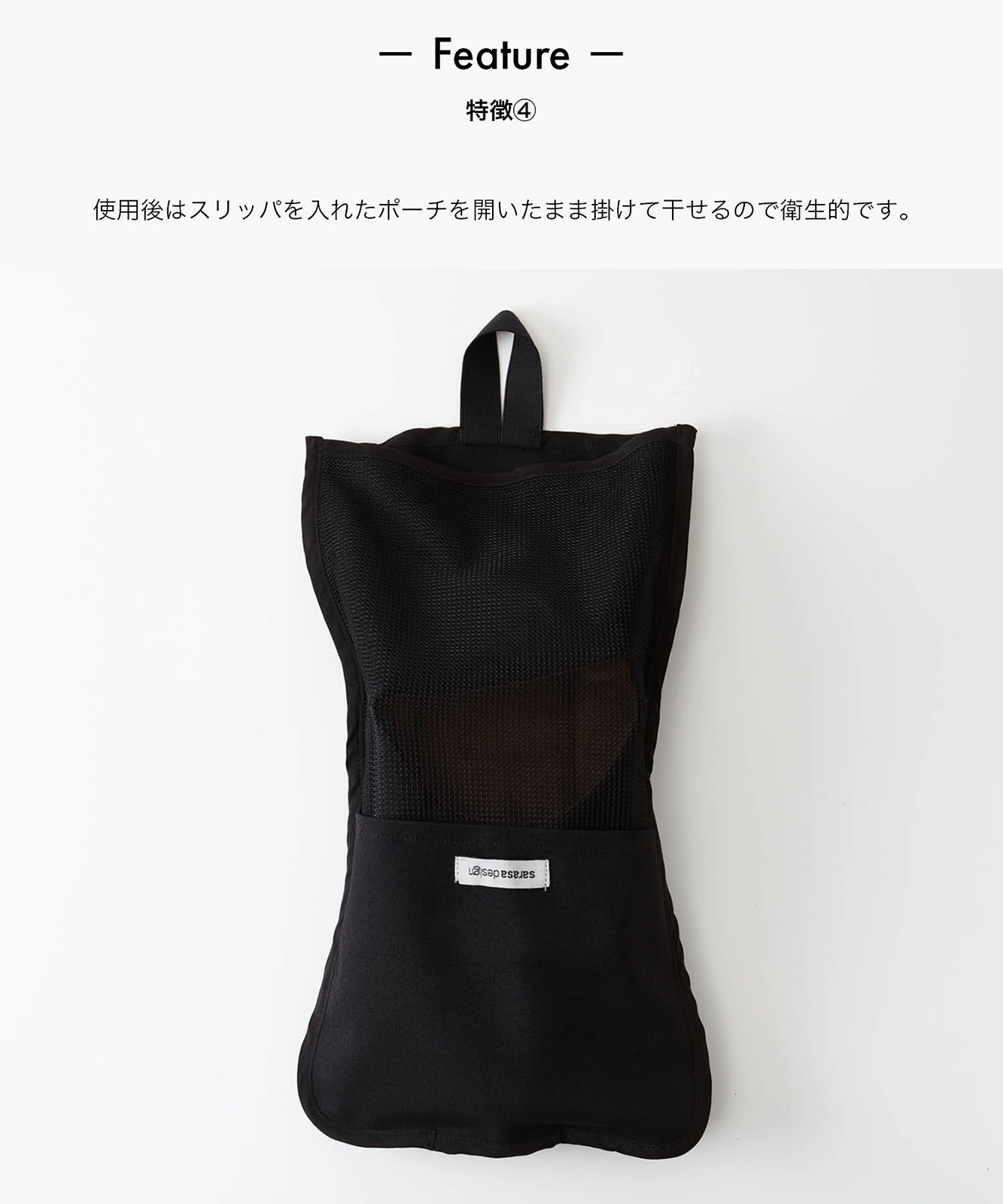 - 使用後はスリッパを入れたポーチを開いたまま掛けて干せるので衛生的です。