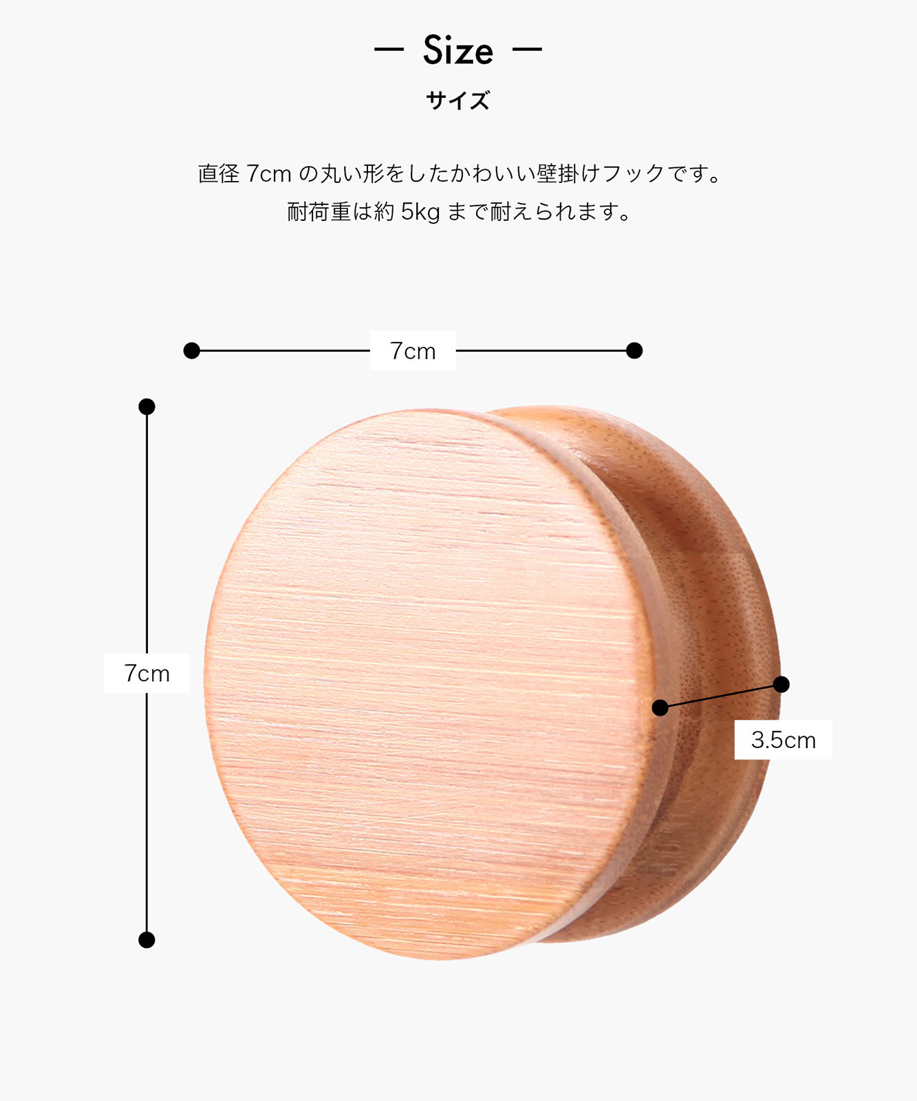 - 直径7cmの丸い形をしたかわいい壁掛けフックです。