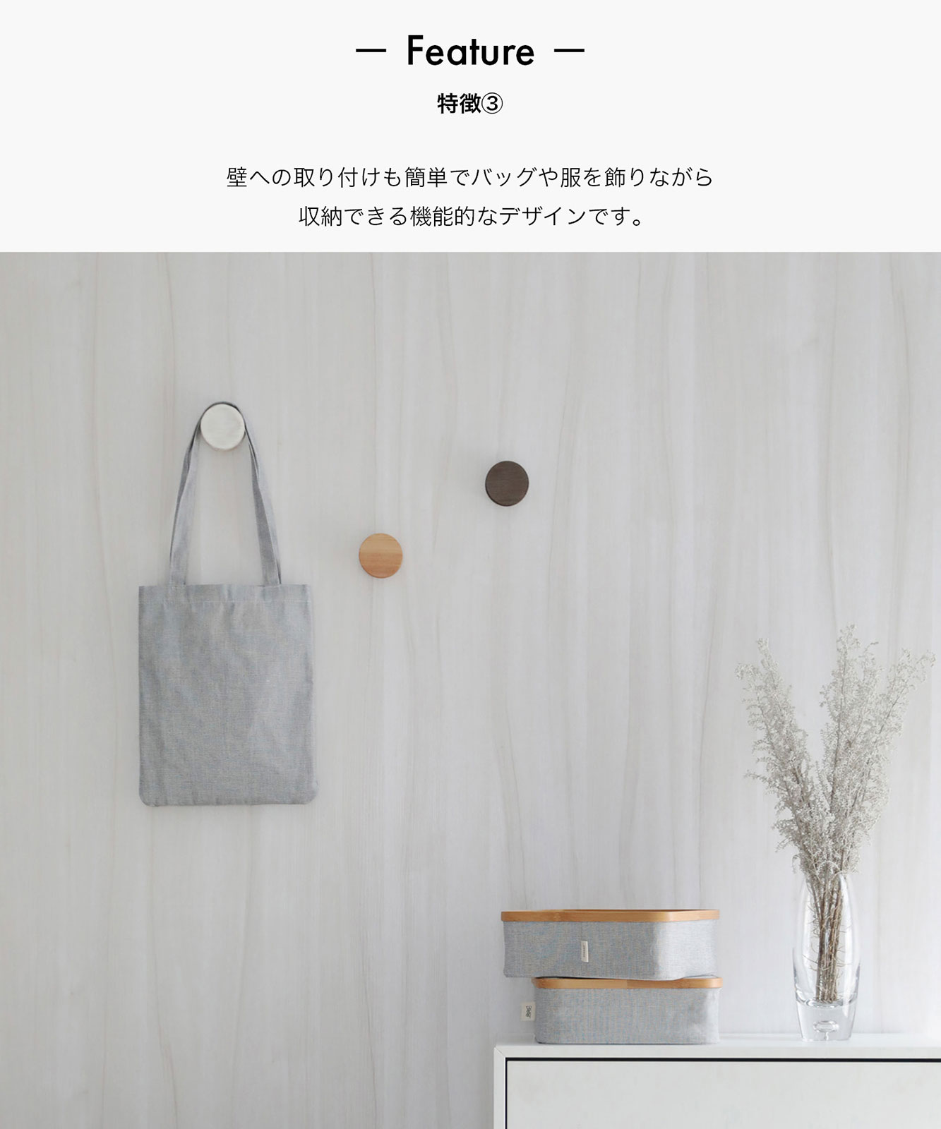 - 壁への取り付けも簡単でバッグや服を飾りながら収納できる機能的なデザインです。