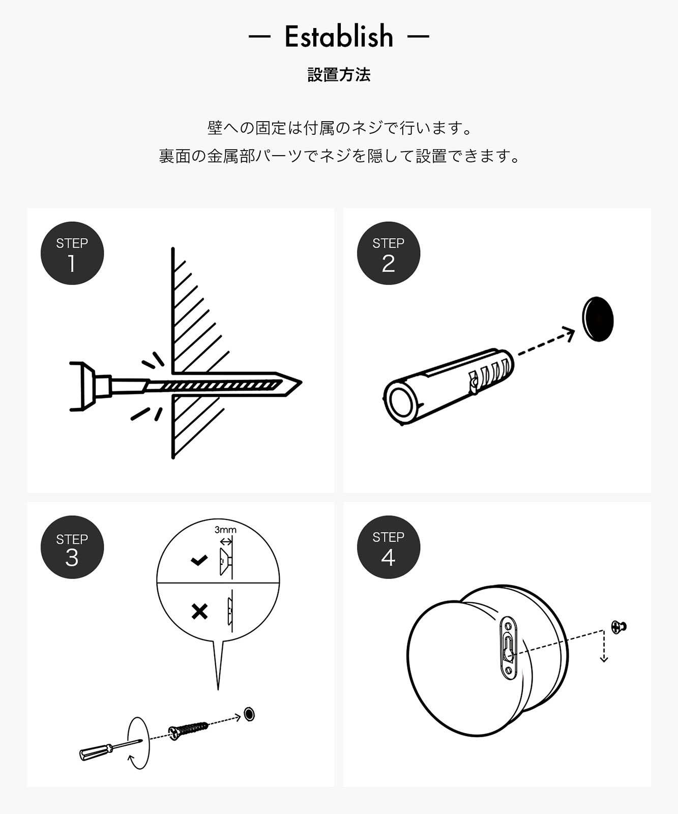 - 壁への固定は付属のネジで行います。裏面の金属部パーツでネジを隠して設置できます。