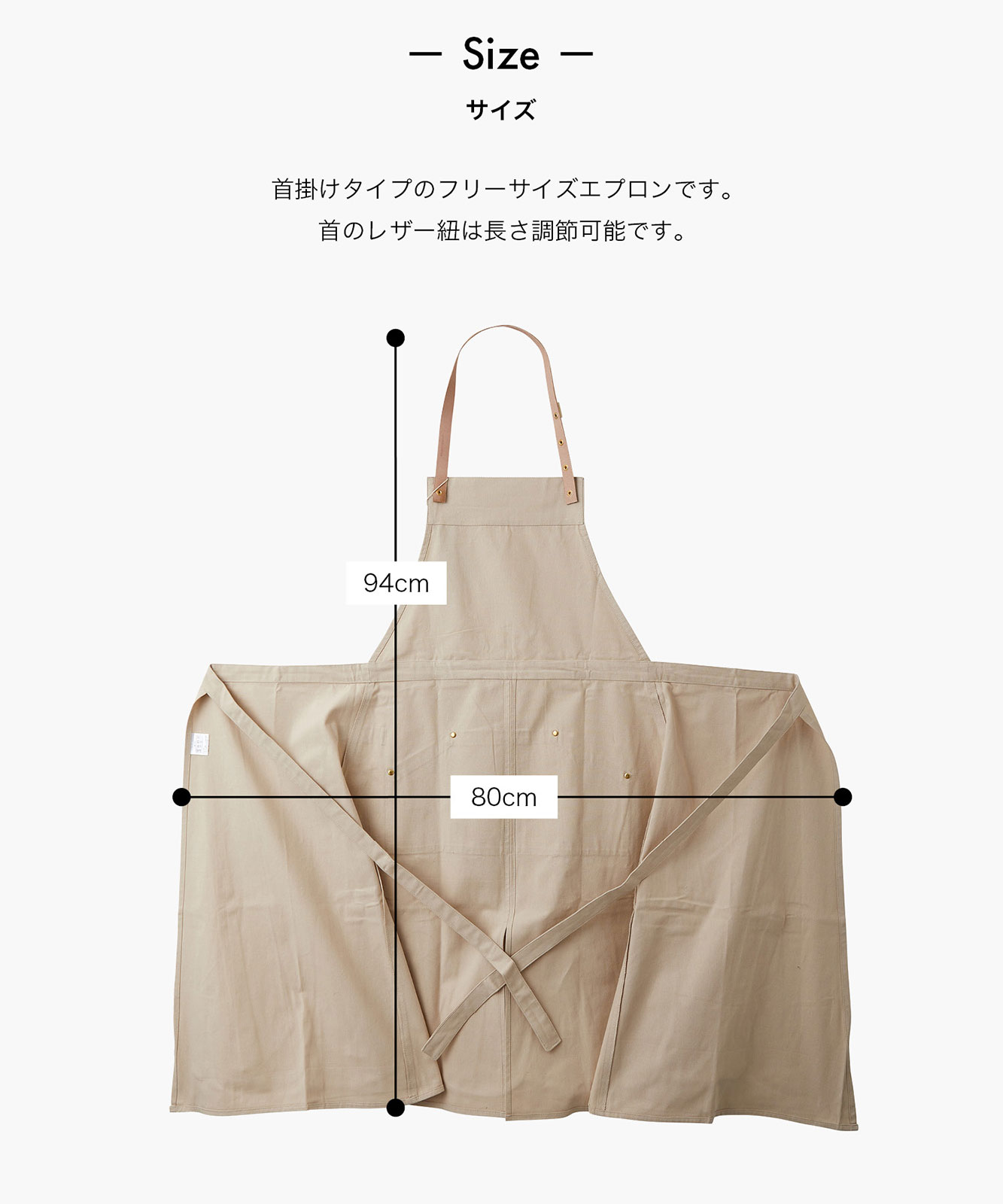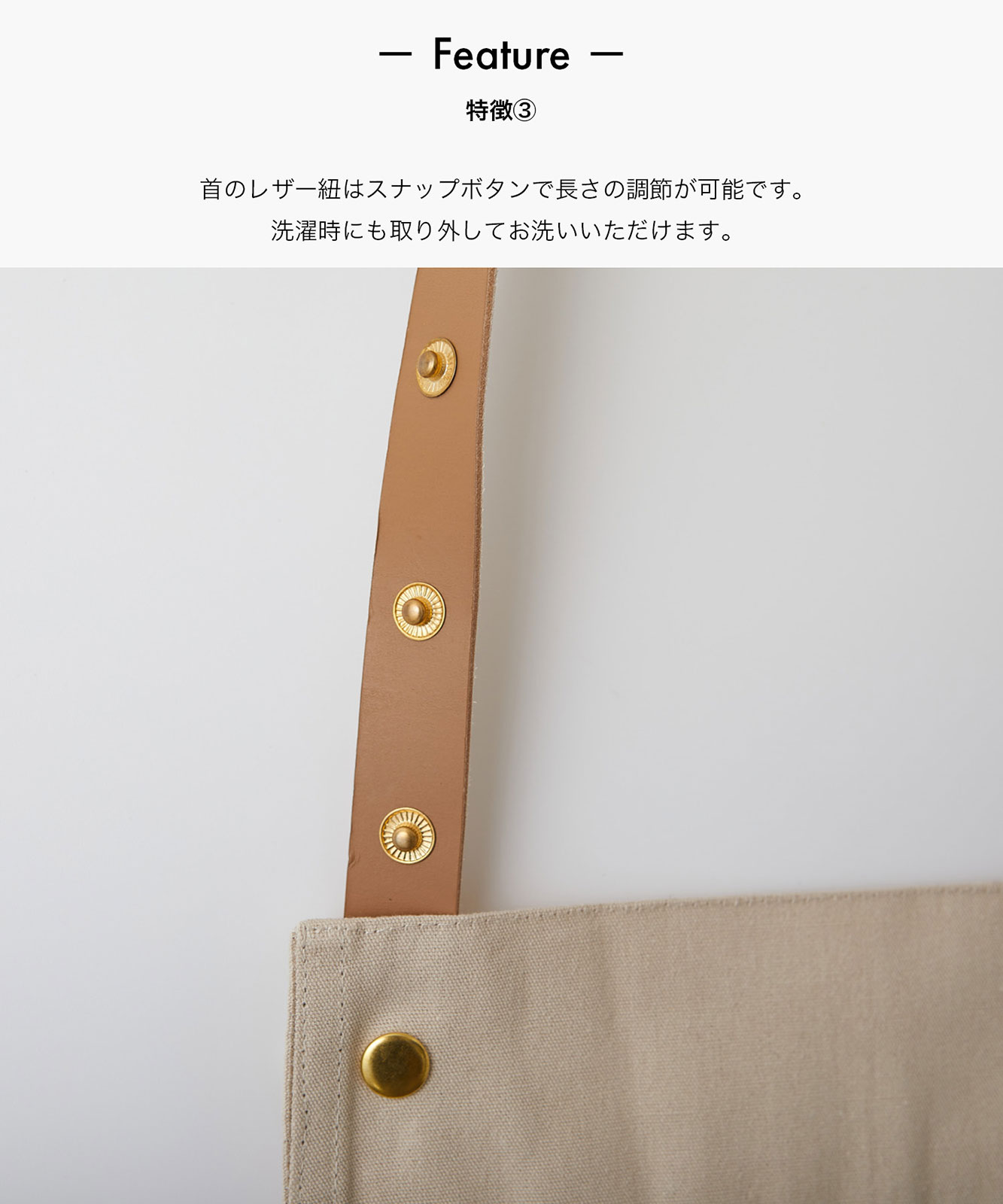 - 首のレザー紐はスナップボタンで長さの調節が可能です。洗濯時にも取り外してお洗いいただけます。