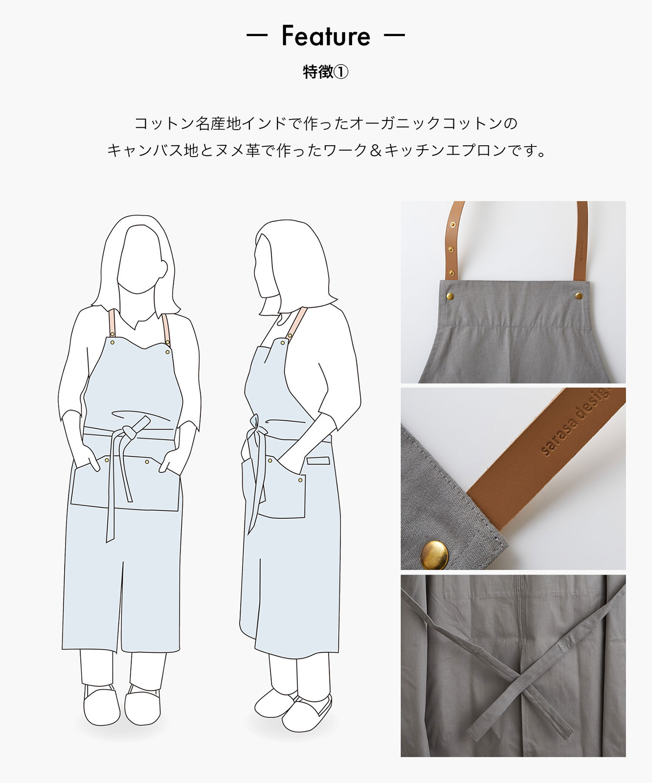 レザーxオーガニックコットン エプロン(フリーサイズ)。コットン名産地インドで作ったオーガニックコットンのキャンバス地とヌメ革で作ったワーク&キッチンエプロンです。