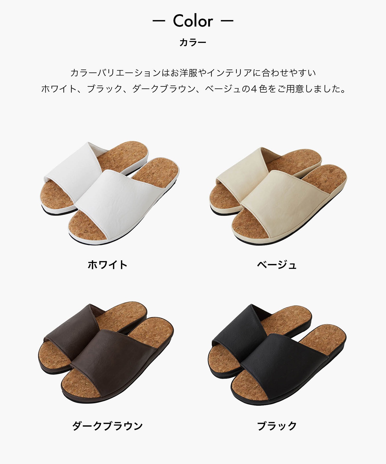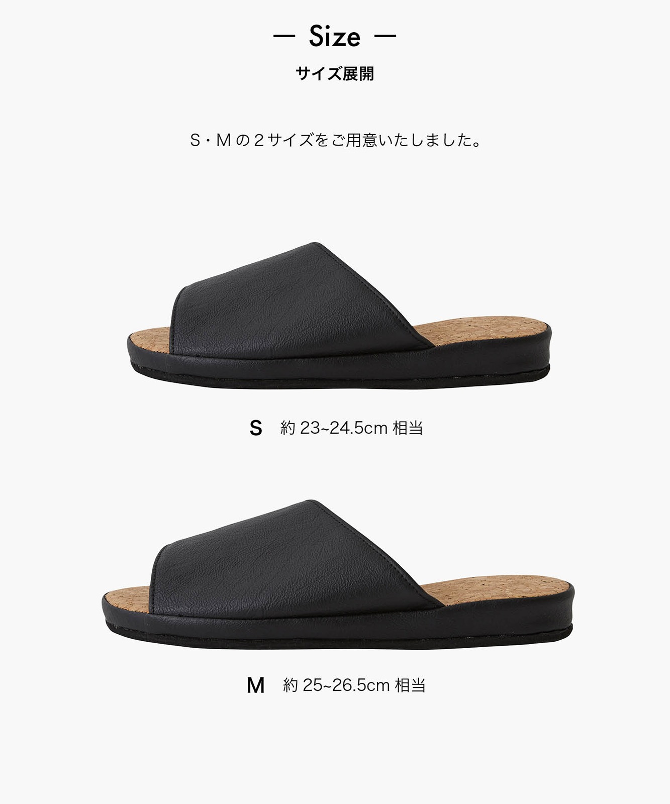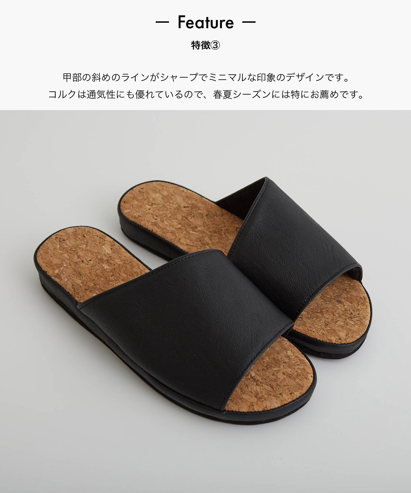 - オープントゥーの履き易いデザインのスリッパです。足裏が当たる部分にコルクを使用しています。