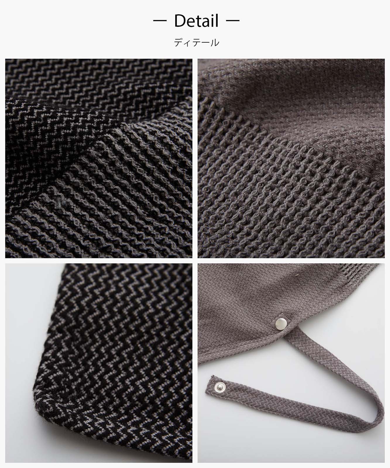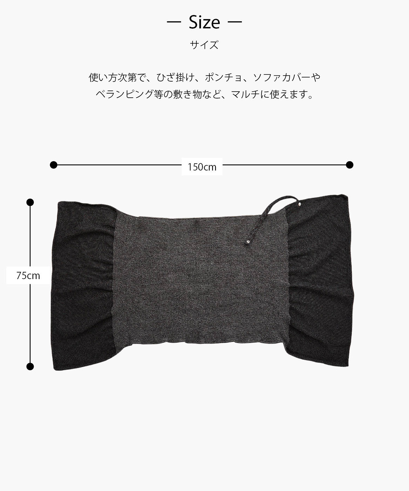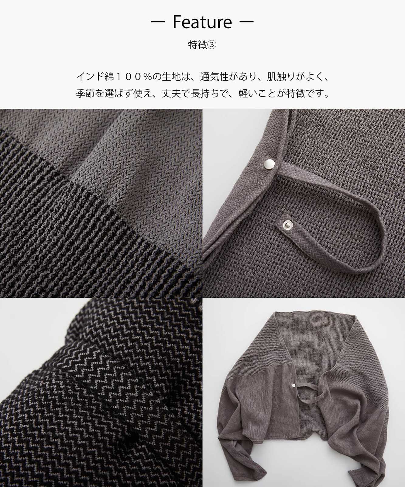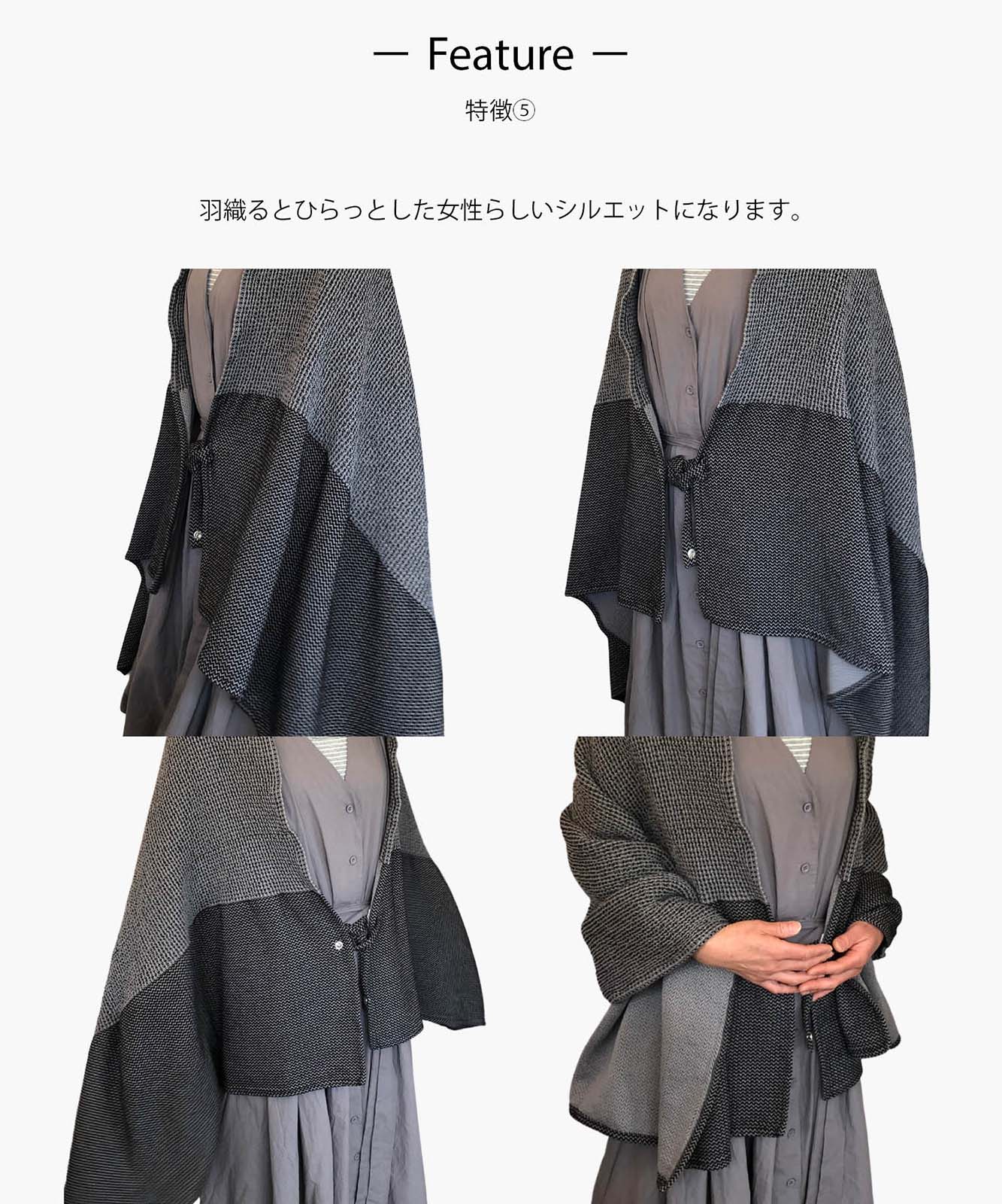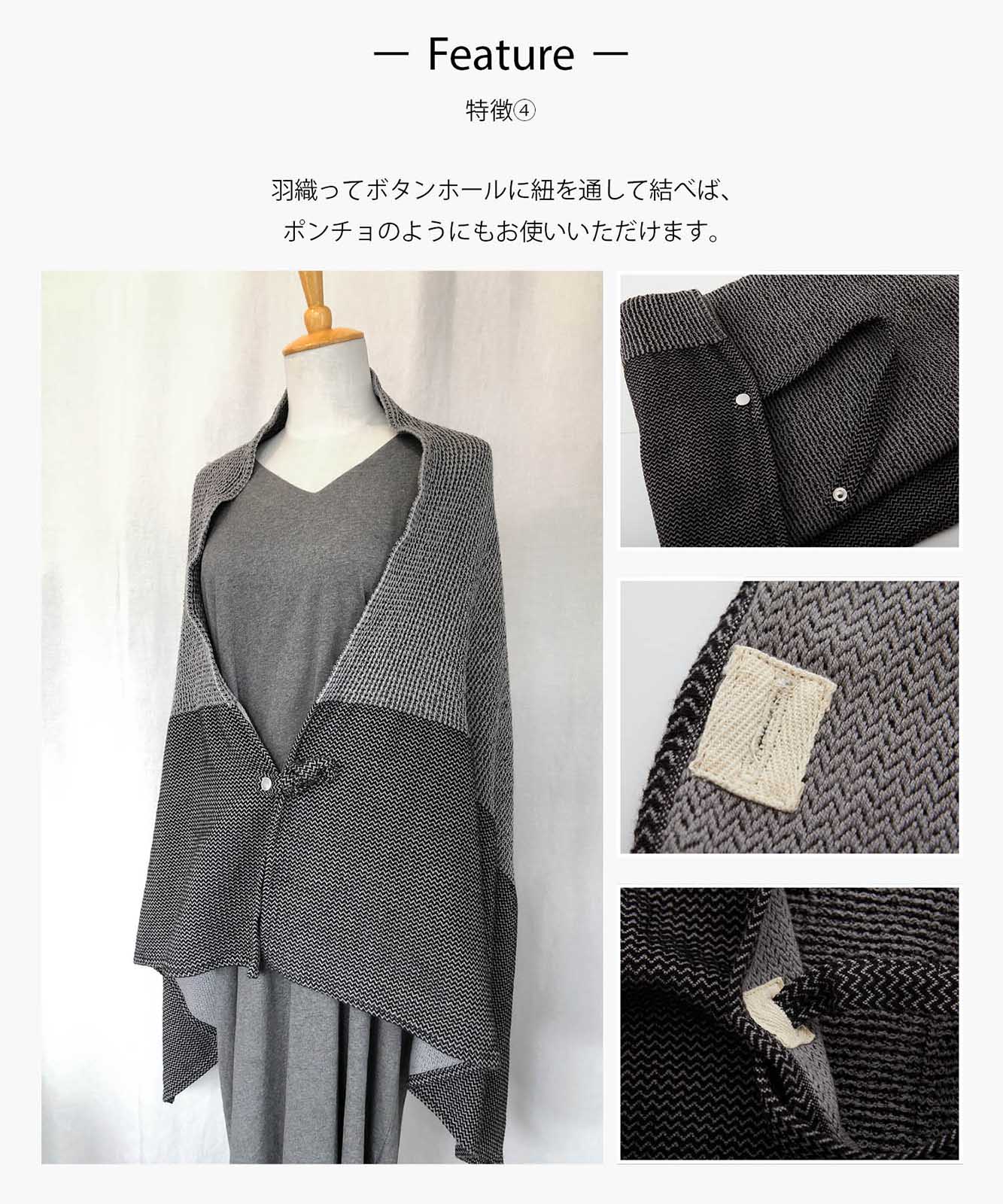 - 羽織ってボタンホールに紐を通して結べばポンチョのようにもお使いいただけます。端がひらっと広がった女性らしいシルエットになります。カラーはモノトーン調ですので、ガーリーになりすぎません。