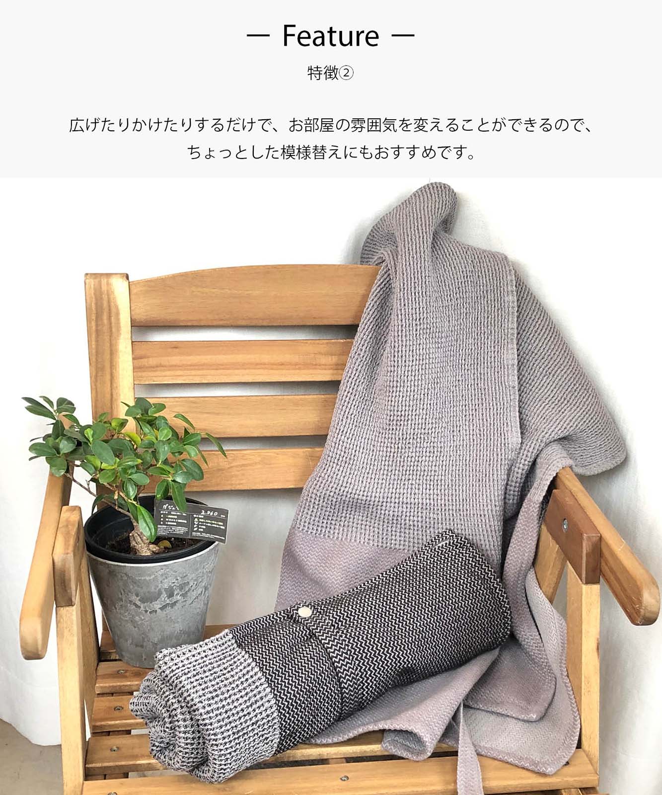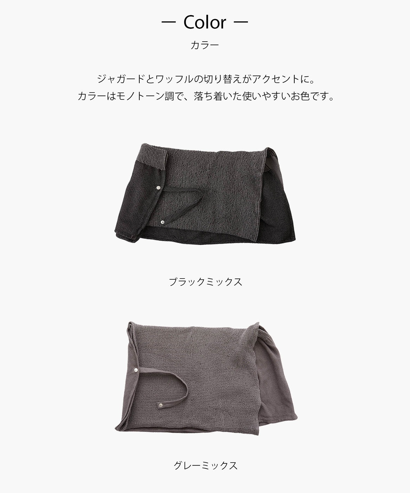 色の異なるコットン糸を組み合わせ、表面を凸凹させユニークな表情を持たせたマルチに使えるマルチブランケット。ジャガードとワッフルの切り替えもアクセントになっており、ひらっとした女性らしいシルエットになるのもポイントです。ソファカバー・ベッドカバー・ベランピング等の敷き物としてもお使いいただけます。洗濯機で洗えるのも嬉しいポイントです。