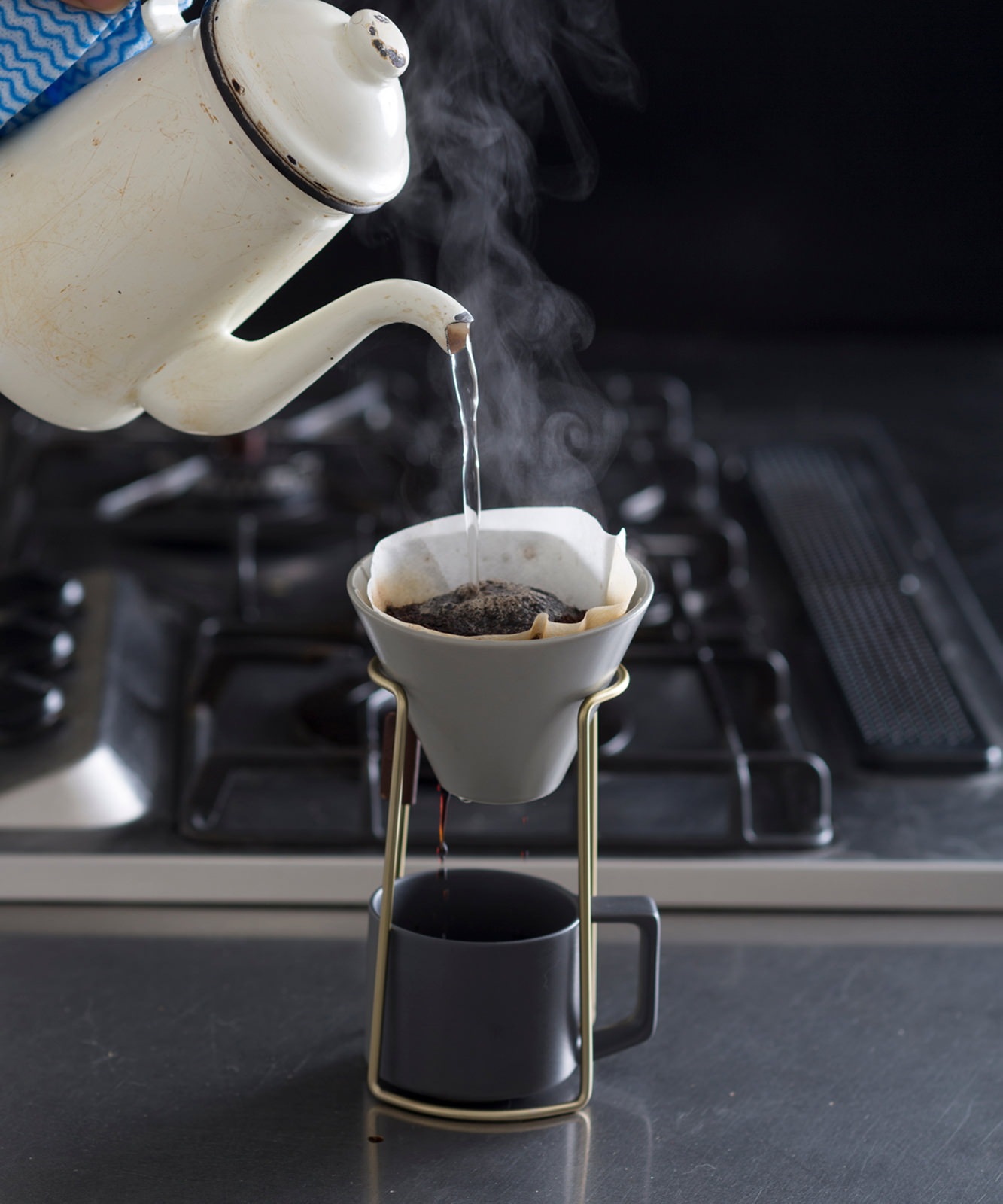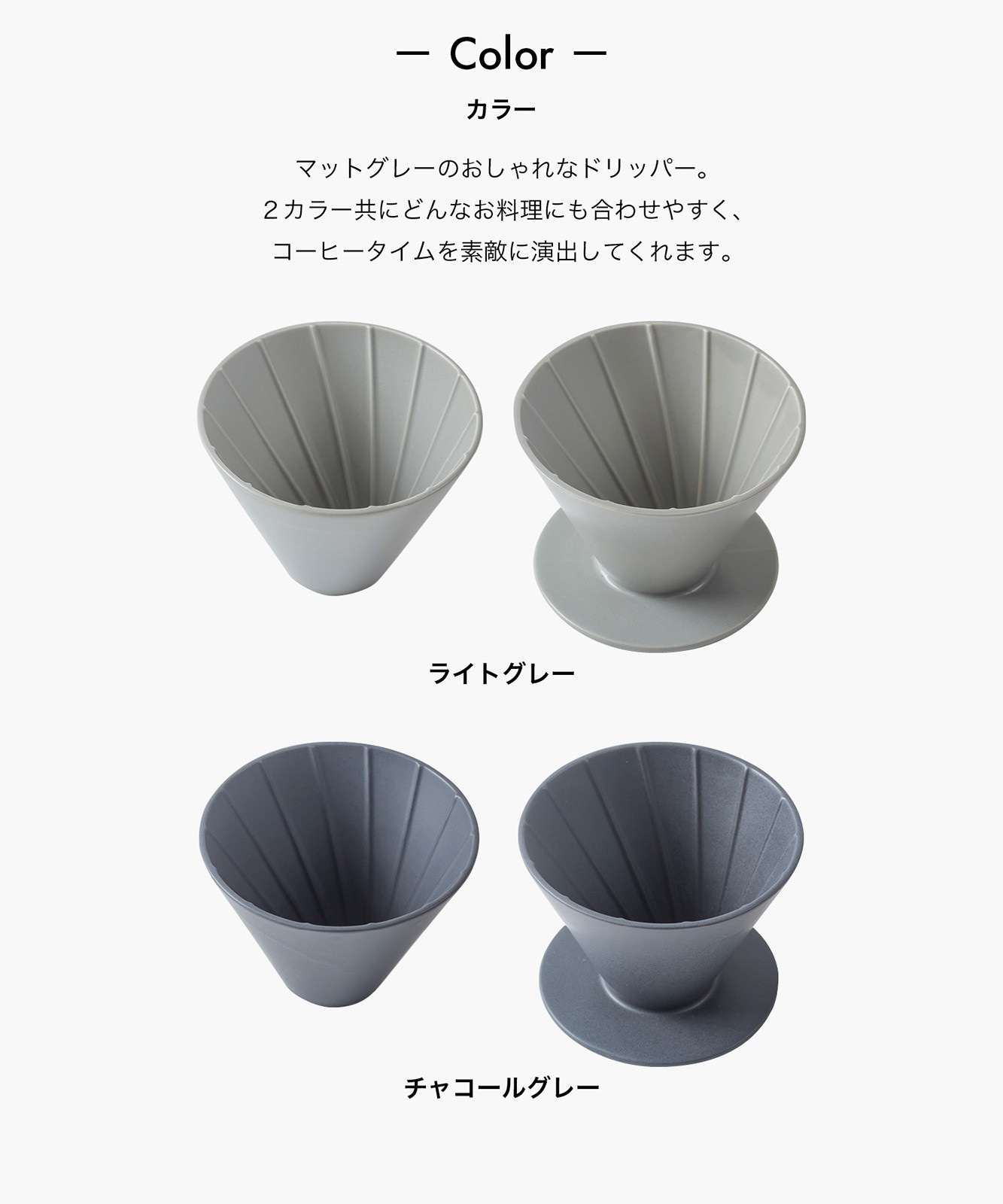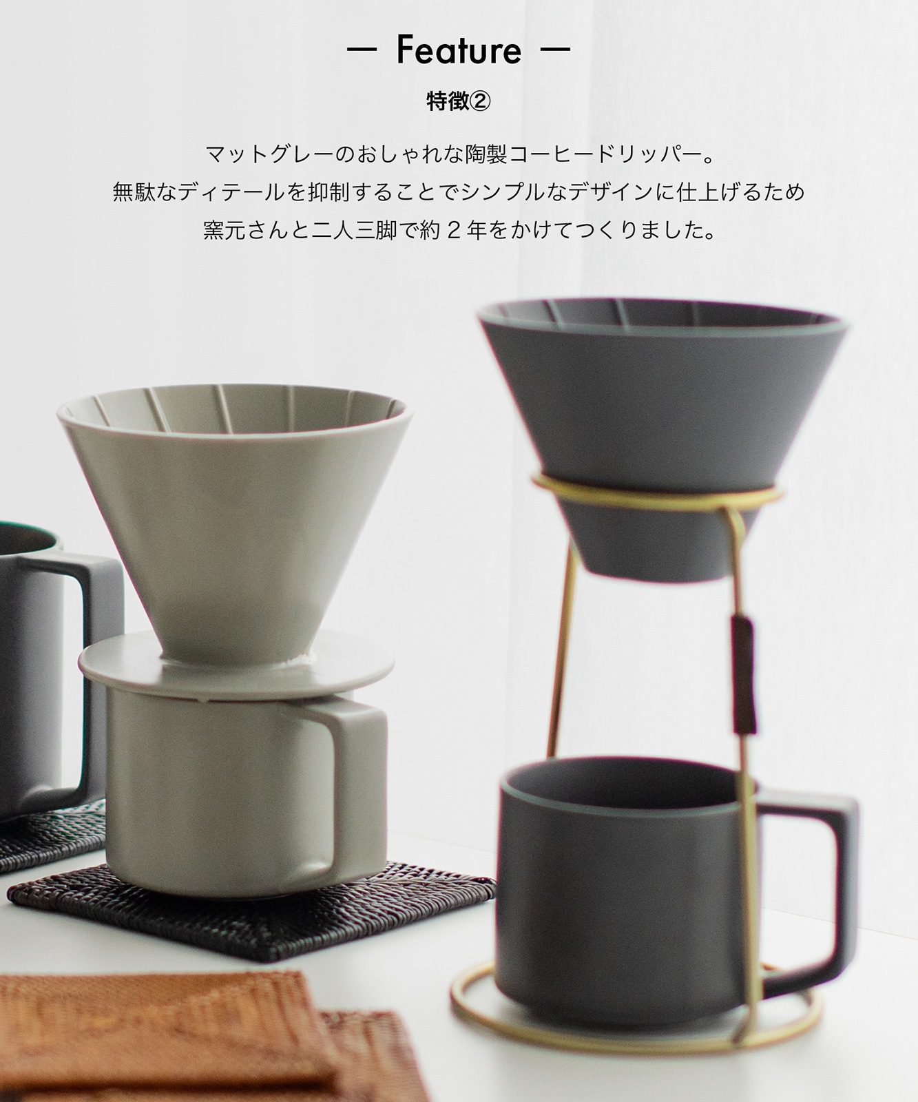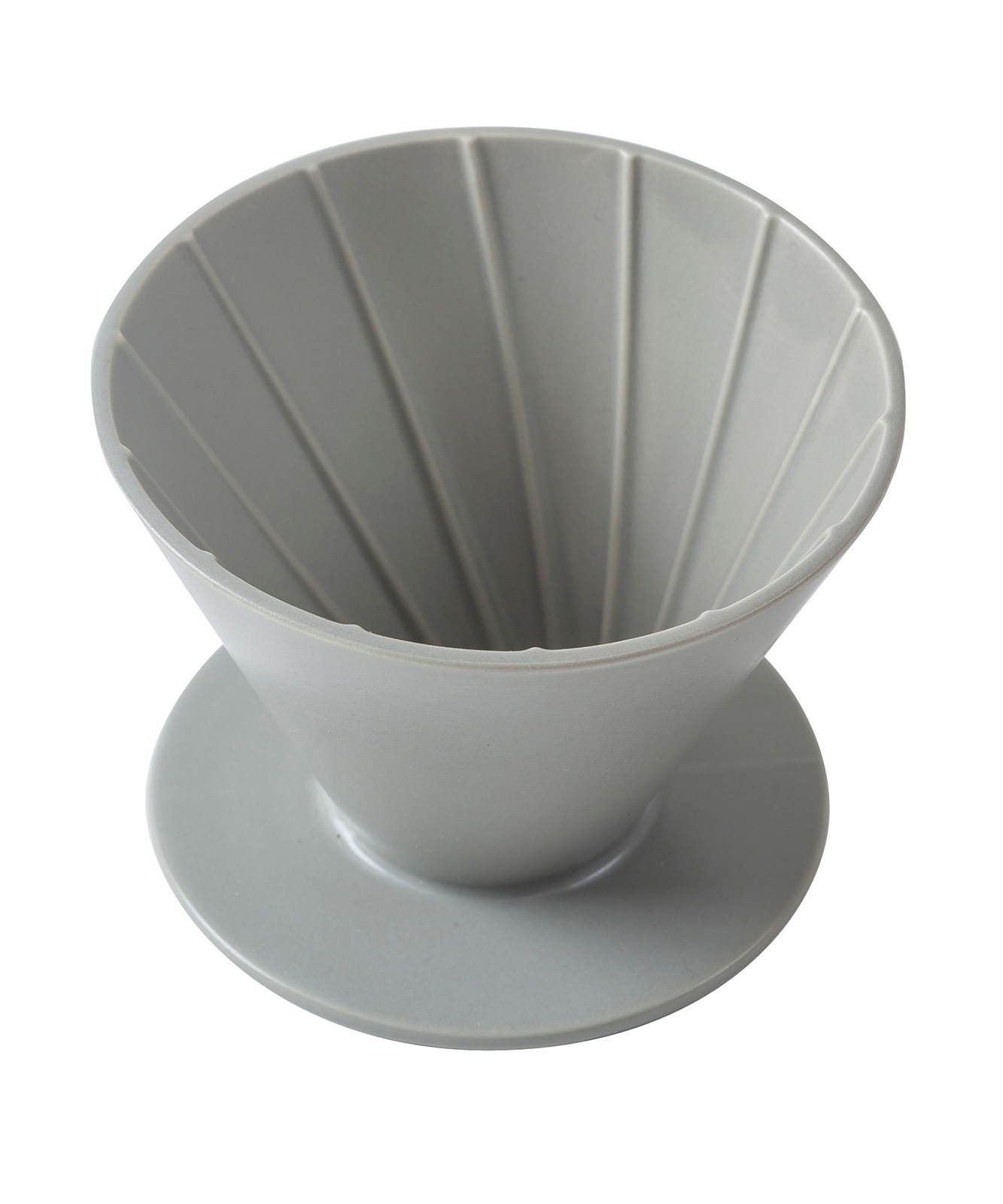 シンプルなデザインのマットグレーの陶製コーヒードリッパー。お気に入りのマグカップにそのまま乗せて珈琲をハンドドリップしてお使いいただけます。