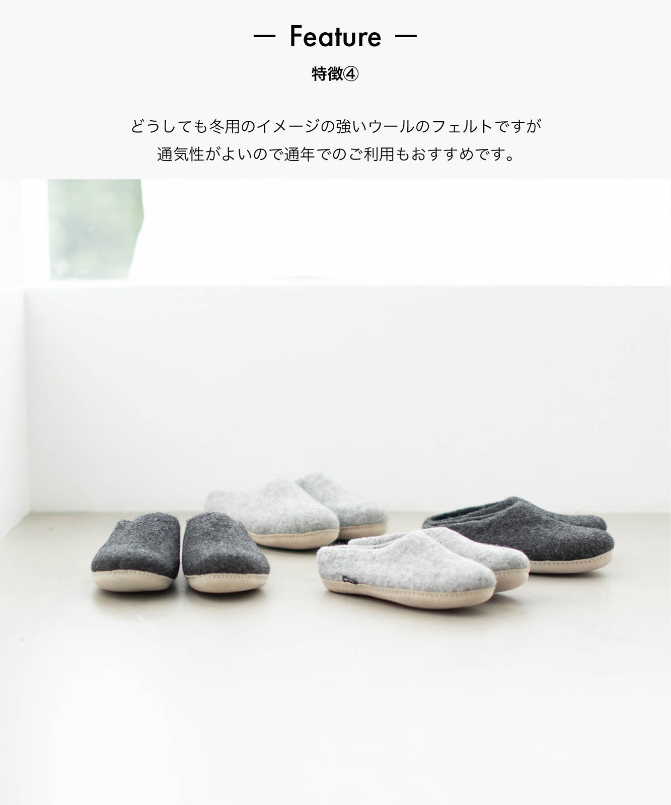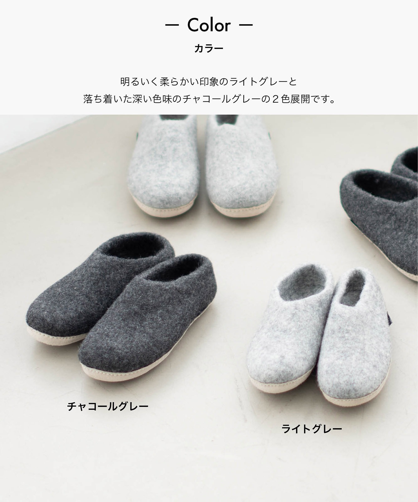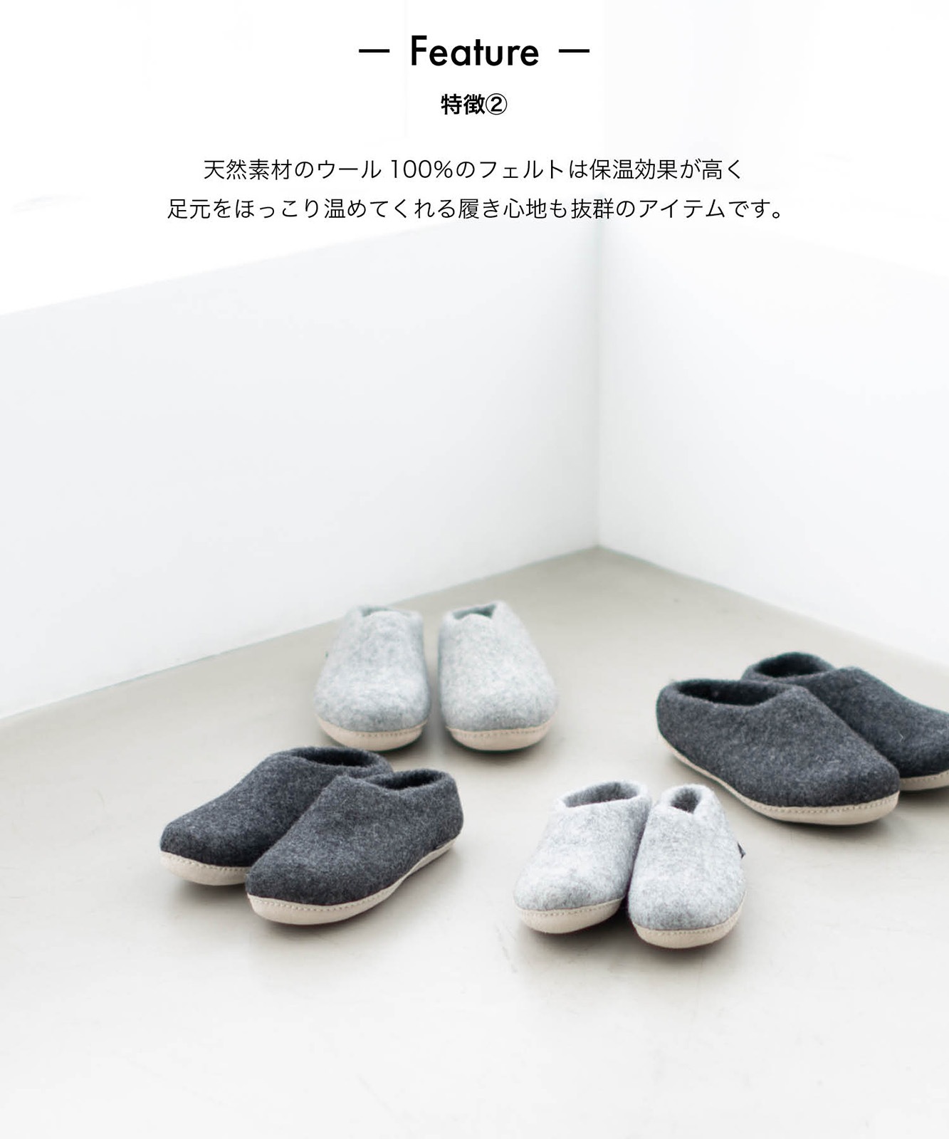 - 天然素材のウール100%のフェルトは保温効果が高く足元をほっこり温めてくれる履き心地も抜群のアイテムです。