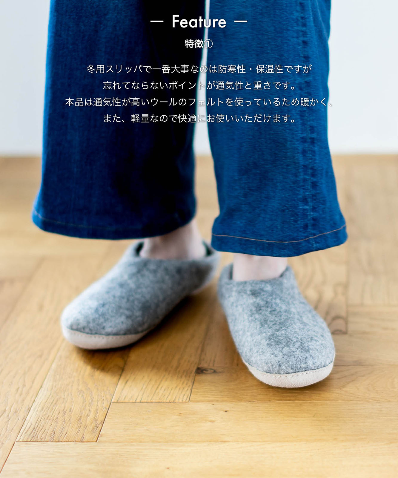- 冬用スリッパで一番大事なのは防寒性・保温性ですが忘れてならないポイントが通気性と重さです。本品は通気性が高いウールのフェルトを使っているため暖かく、また軽量で快適にお使いいただけます。