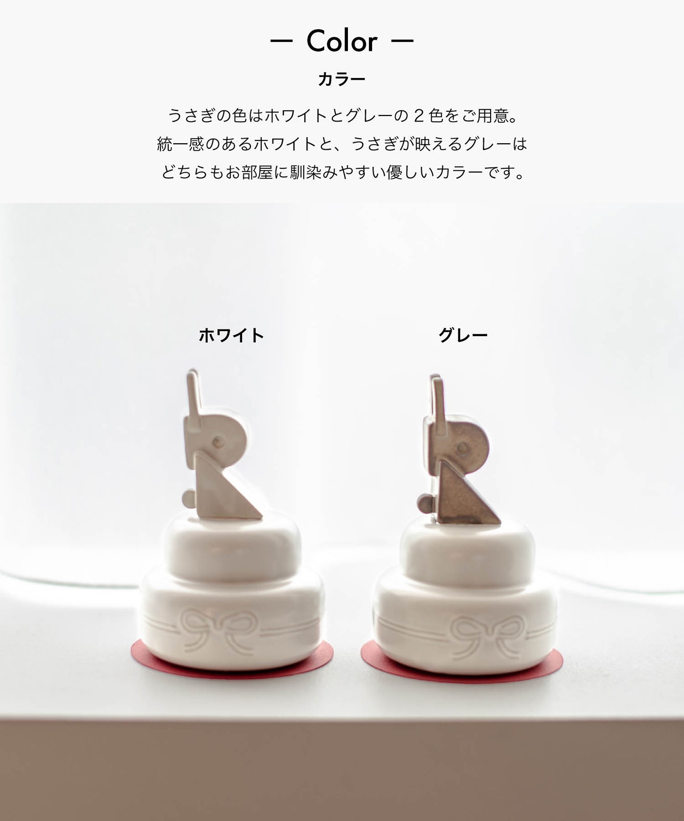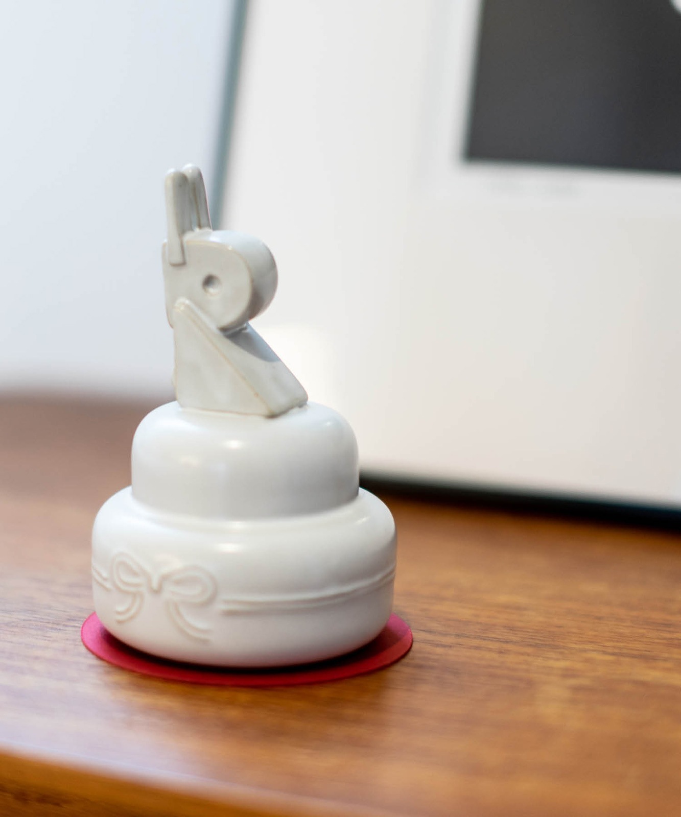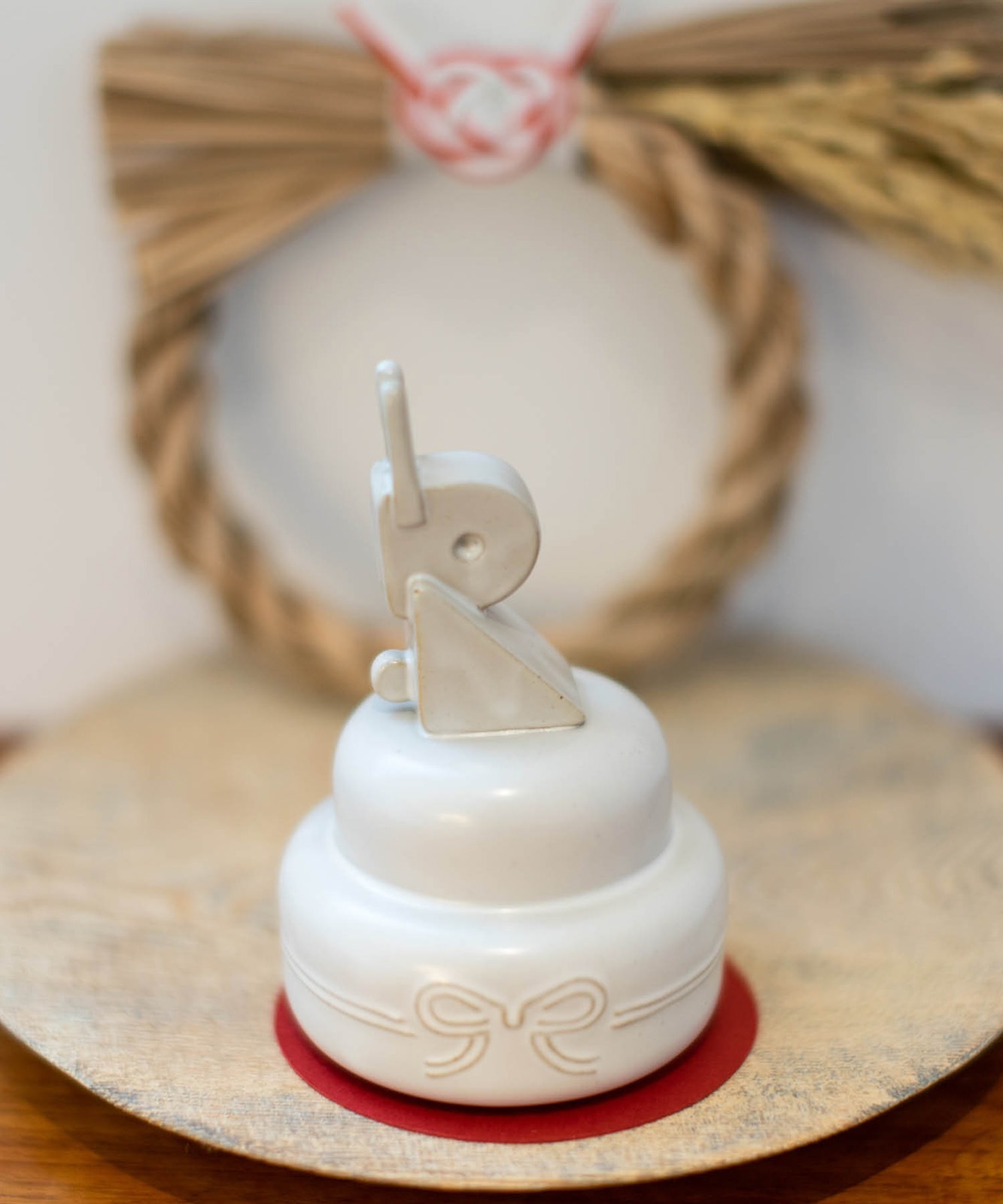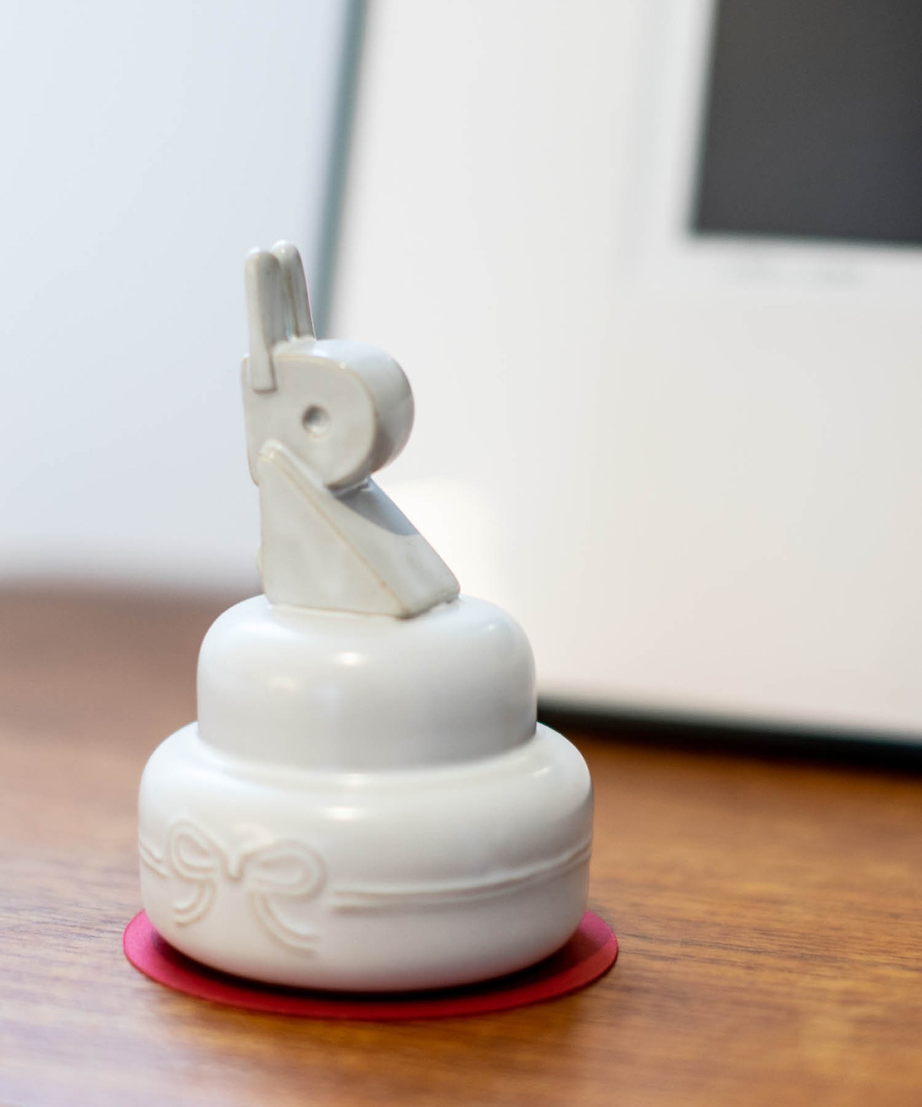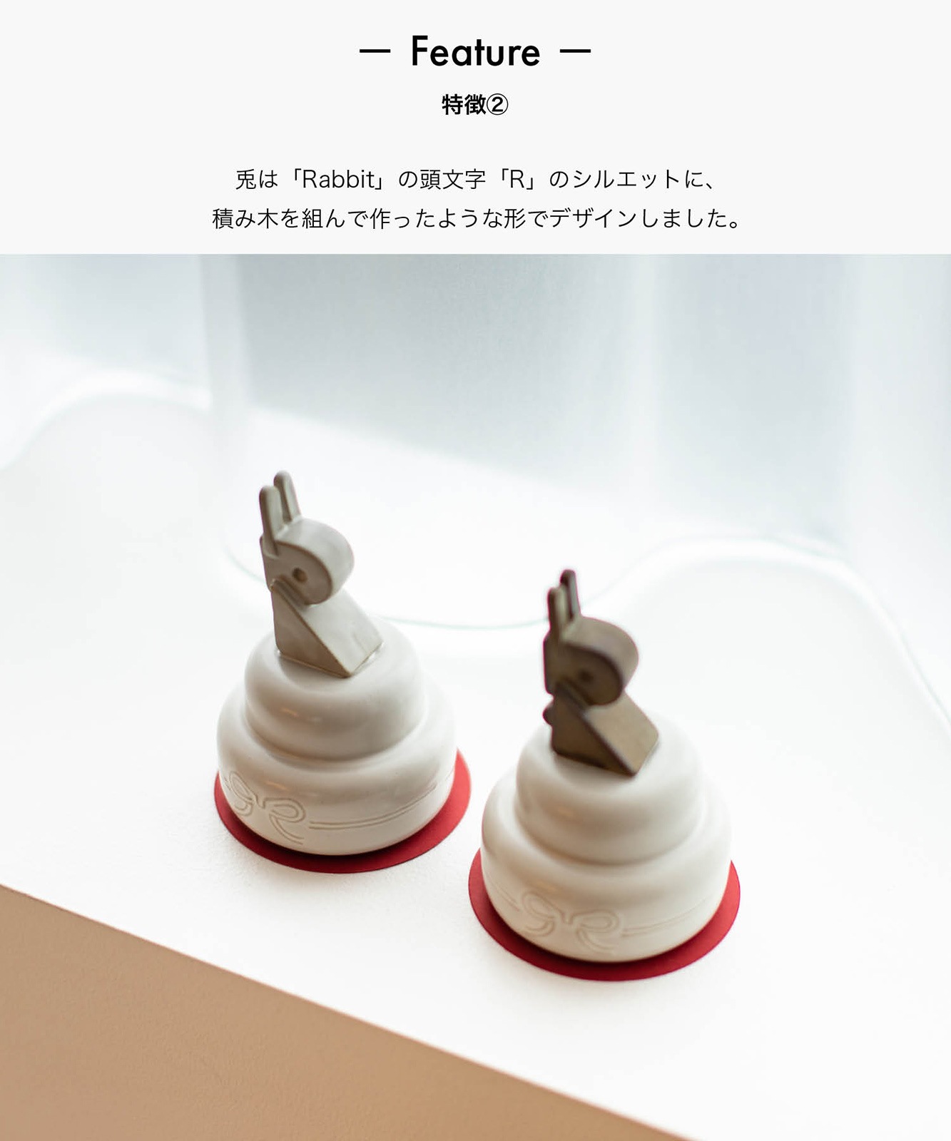 年神様の依り代として飾る鏡餅をモダンにアレンジしました。お餅の上には、橙の代わりに干支の「兎」を乗せています。兎は「Rabbit」の頭文字「R」のシルエットに、積み木を組んで作ったような形でデザインしました。