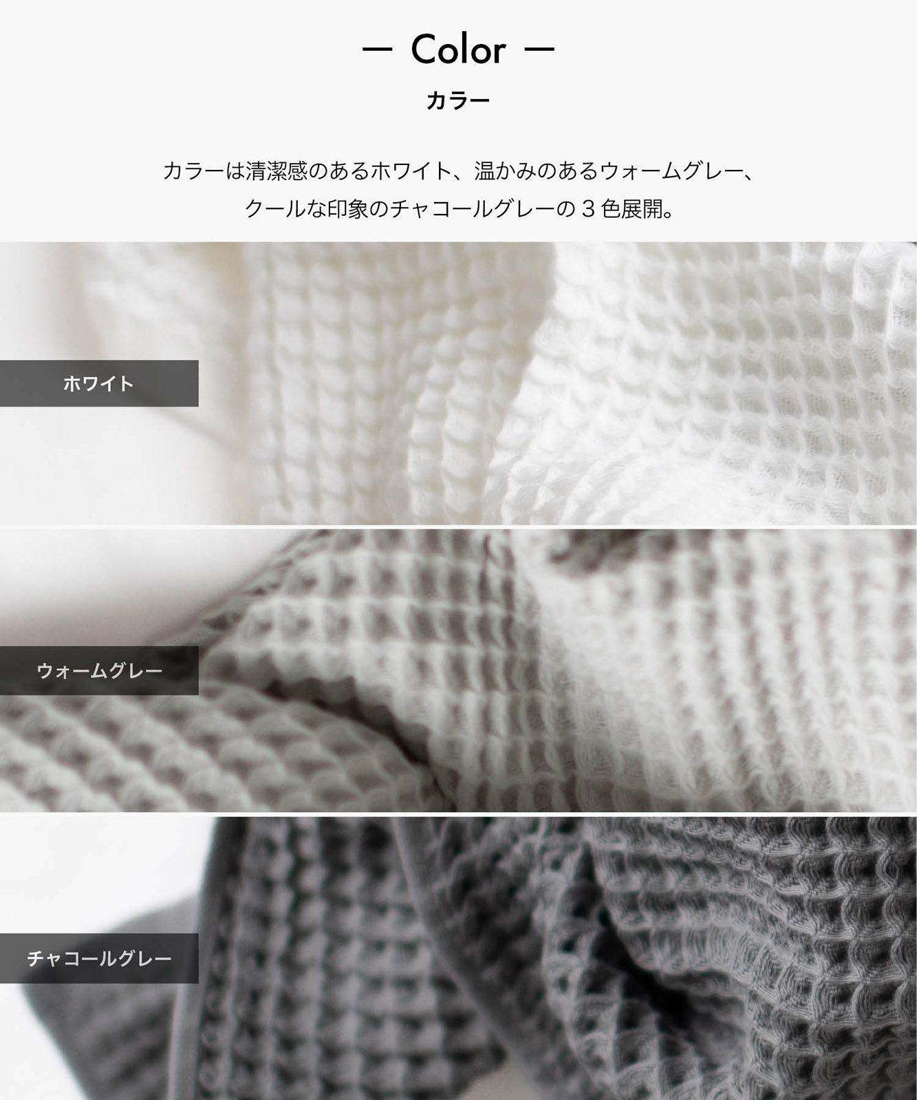 - ワッフル地はパイル地に比べて表面積が大きいため乾きやすく、特徴的な凹凸により肌に触れる面積が小さいためサラリとした肌触りなのが特徴です。